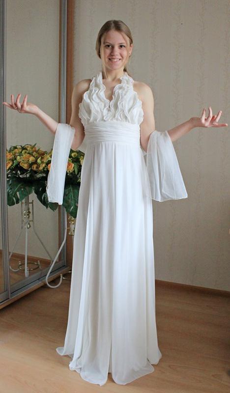 В зв'язку з закриттям магазину,пропоную Вашій увазі дуже гарні вечірні,випускні наряди-сукні ! Фабрична Туреччина! Євростандарт на хороший зростання! Сукня кольору авори з сирійського шифону на атласній підкладці.Низ сукні сформований у вигляді 11 пелюсток квітки,які фіксуються під поясом.Плаття підійде на ріст 180 см