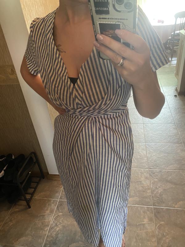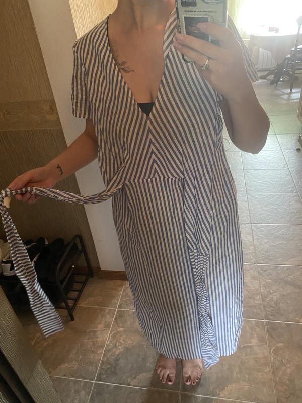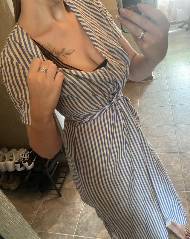 Прекрасное голубое платье с красивым вырезом на груди и поясом, который переплетается спереди под грудью и сзади завязывается.