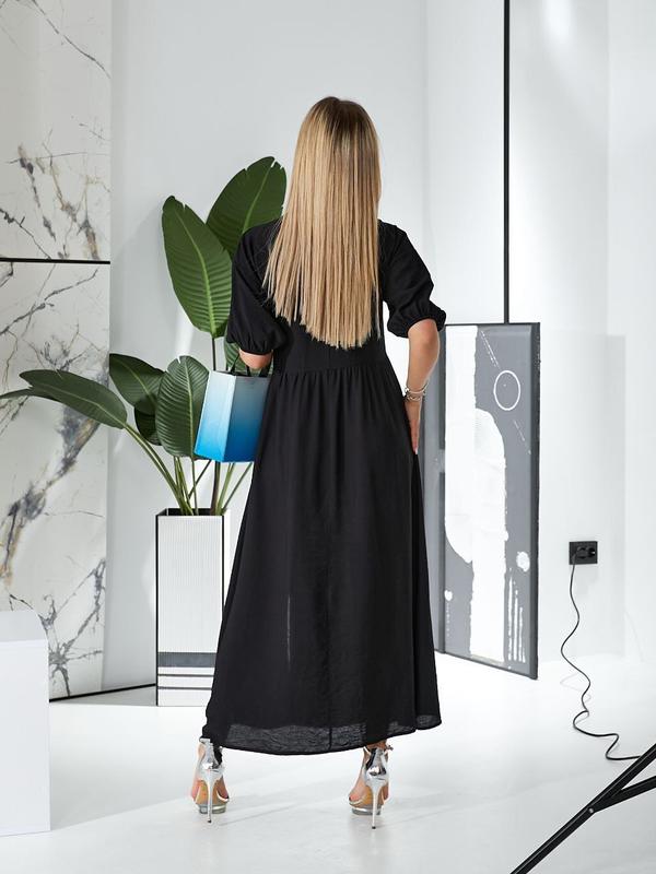 Сукня міді з легкої тканини жатка-льон. Модель з рукавом -ліхтариком та ефектним v- образним вирізом на грудях, також є розріз на нозі, який підкреслює красу ніг .Розкльошоний крой спідниці, створює романтичний і легкій настрій. Під дану сукню підійде різне взуття!