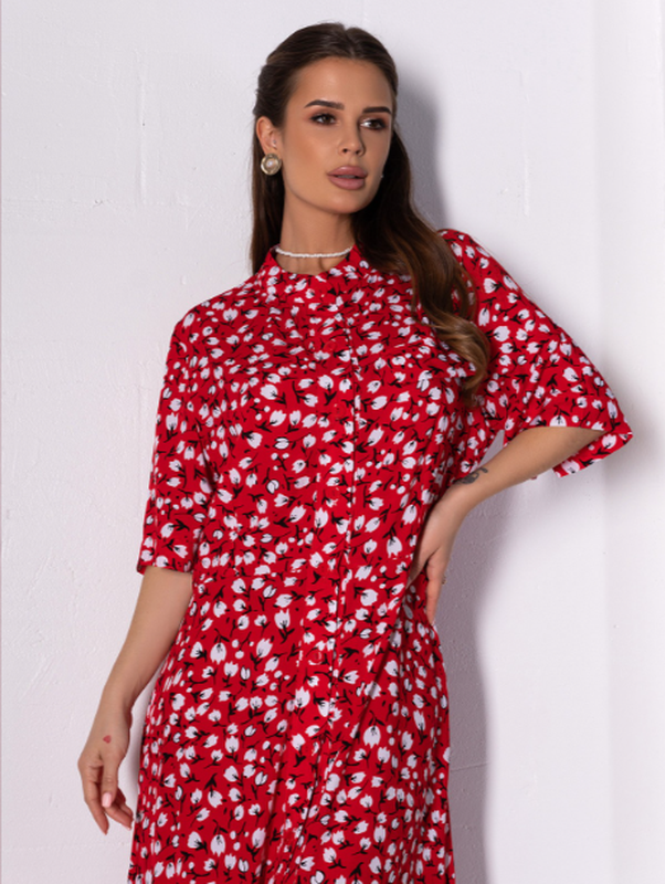 Червоне квіткове плаття-сорочка максі довжини з бічними розрізами, виготовлене зі штапелю. Плаття з бічними кишенями та коміром-стійкою. Модель на ґудзиках із короткими рукавами та декоративним нагрудним клапаном.