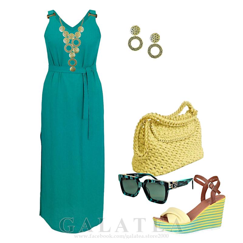 Бірюзова довга сукня – сарафан з льону