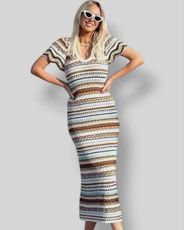 👗 Плаття ZARA гачком — бохо-стиль ✅ Матеріал: щільна бавовняна пряжа ✅ Кольори: поєднання білого, блакитного, жовтого, коричневого та чорного ✅ Візерунок: смугастий, ажурний, виготовлений гачком із чергуванням фактур ✅ Крій: Вільний, злегка приталений Довжина: максі Рукав: короткий, хвилястий край, злегка пишний Горловина: V-подібний виріз із в'язаною облямівкою ✅ Спинка: округлый вырез ✅ Без підкладки, напівпрозоре в'язання ✅ Виробництво: Туреччина ✅ Розмір на бирці: L (EUR/USA/MEX), підійде і на розмір М. Це плаття чудово підійде для літа, відпочинку, пляжу або повсякденного образу в стилі бохо. Має яскравий та оригінальний вигляд завдяки ручному в'язанню та грі текстур. Заміри за запитом.