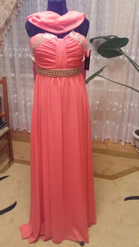 Вечірня сукня коралового кольору, йде корсетом, але є до неї брителі які відстібаються, також в комплекті йде шалик. Сукня Нова з біркою, альо є дифект на поясі тріснули скріплення на поясі, тому ціна занижена. А так із сукнею все добре.