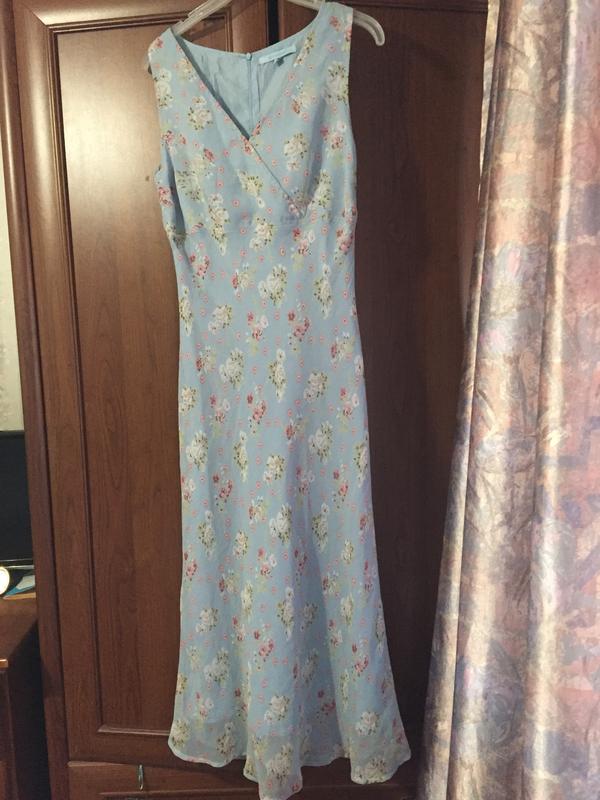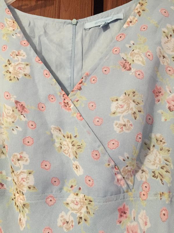 Довге ніжне плаття Atmosphere небесно блакитний з квітковим принтом. Тканина шифон, на підкладці, ззаду блискавка. Реальний колір на двох останніх фото. Розмір 14. Заміри: довжина 115, пахви 45, побіди 52.