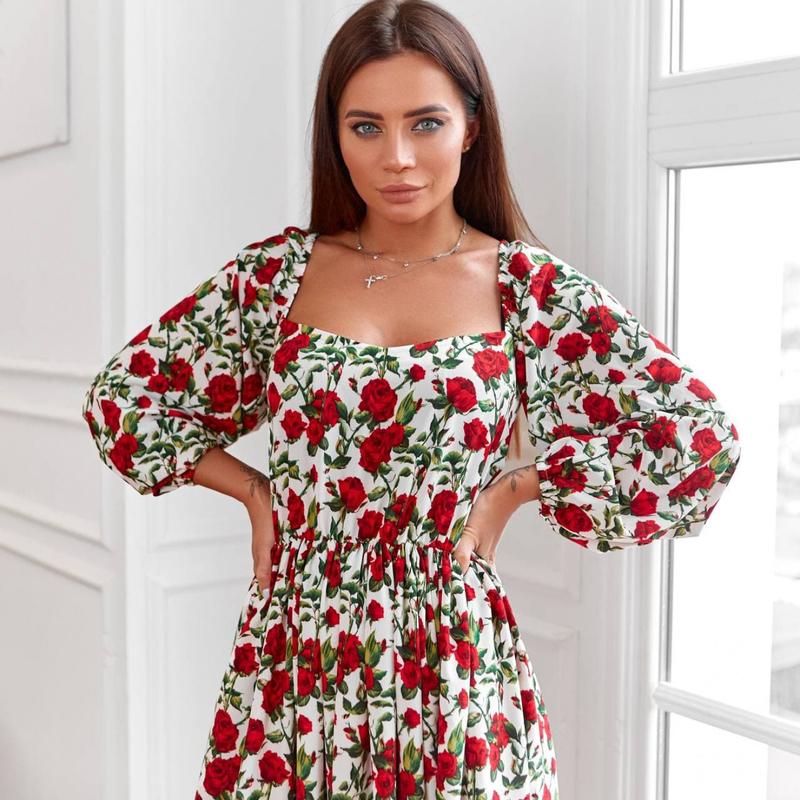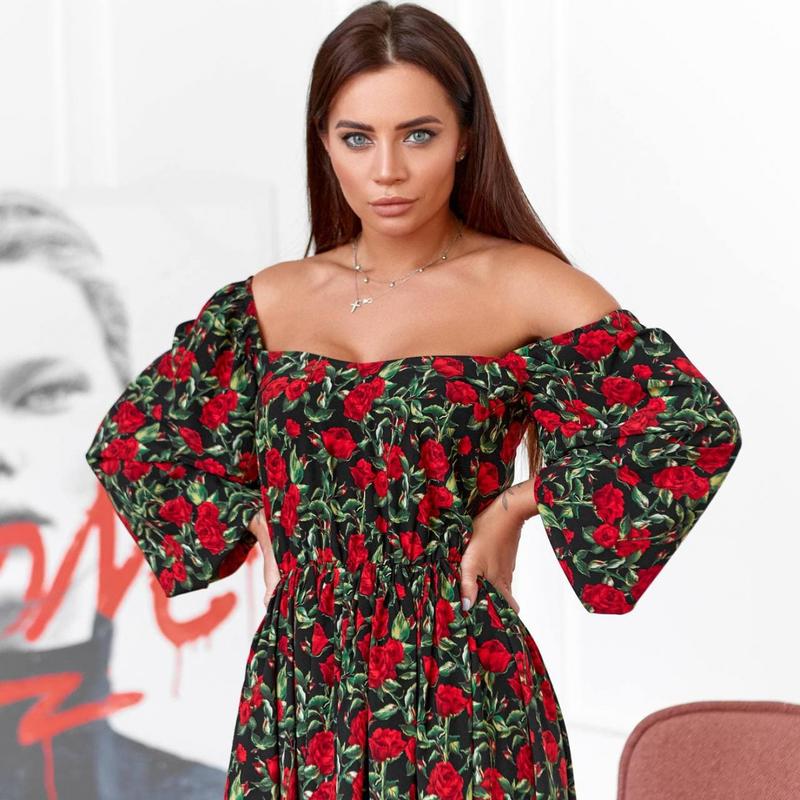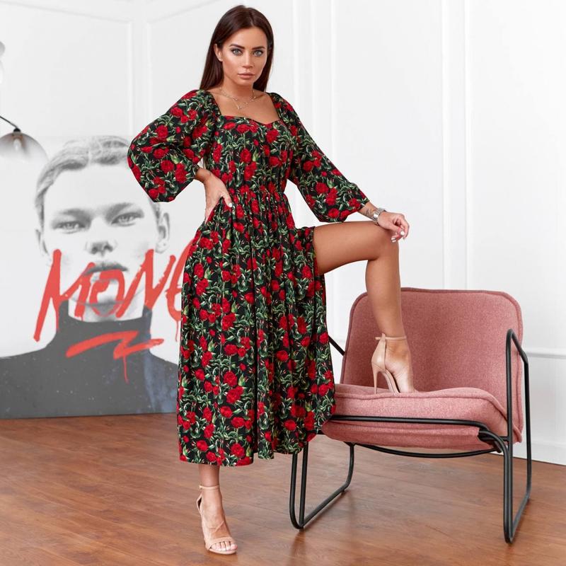 Розкішне жіноче плаття довжини міді. Плаття з довгими широкими рукавами і актуальним квадратним вирізом декольте. Плечі можна підняти або опустити за бажанням. Підкреслює талію гумка, від стегна йде розріз. Сукня виконана з тканини софт. В наявності сукня в квітковий принт в двох кольорах: чорний і білий. Виробник: ТМ Elena Pokalitsina Модель:11777-2