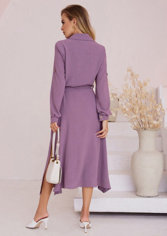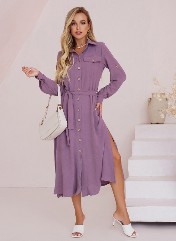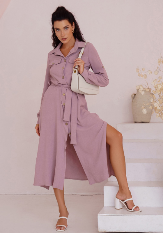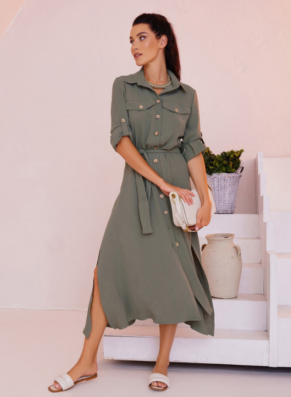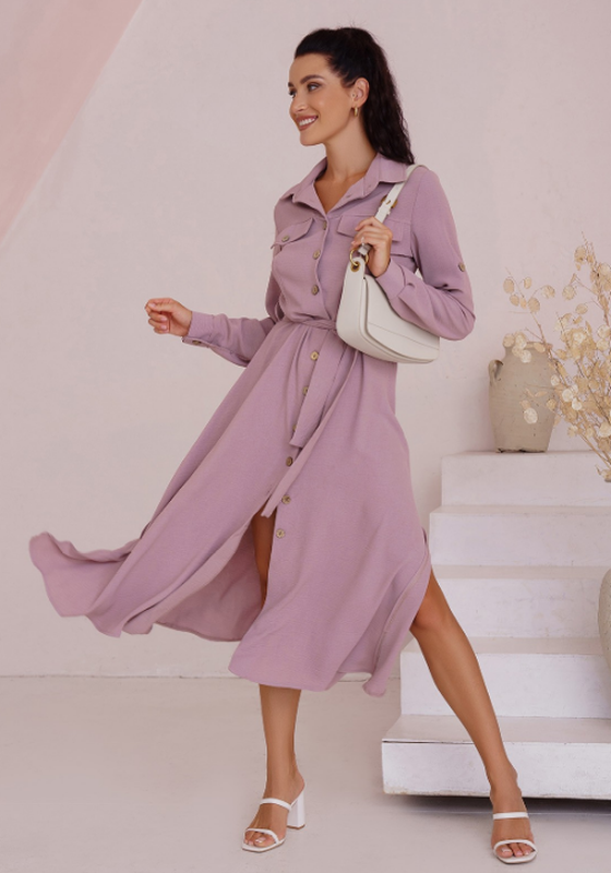 Повседневное платье-рубашка на пуговицах с длинными рукавами на манжетами оснащенными пуговицей и хлястиком для подворота. Платье приталенного кроя с воротником и боковыми разрезами. Изделие миди длины с клапанами на груди и съемным поясом выполнено из текстурированного крепа.