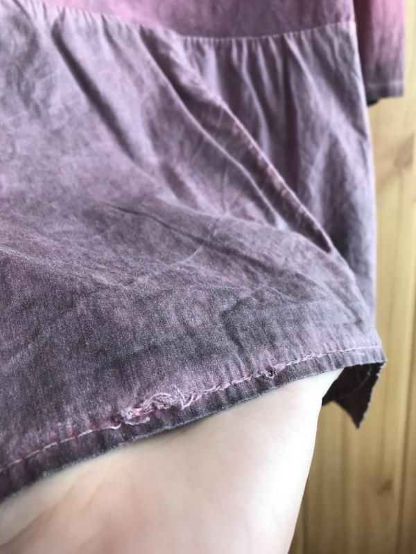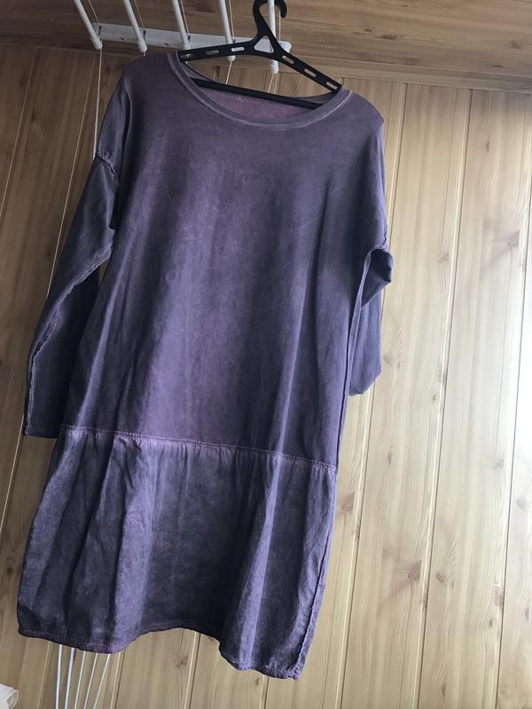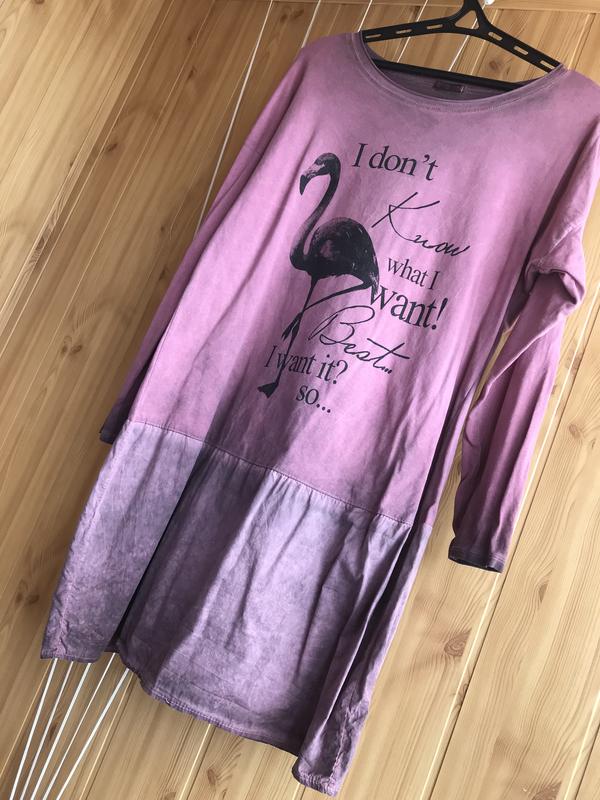 Італійська зі 100% котону сукня фіолетово-бузкового кольору з чорним малюком фламінго у розмірі М-L. Верх трикотажний, як футболка, низ, оборка з котону, як літній джинс, не приталена, трохи а-силуету. Вдягала кілька разів. Довжина не моя та фасон не зовсім мій. Примітна річ, при цьому вішукана та, за рахунок малюнку, неординарна. Невеличкі «трабли» з ниткою шву знизу (дві останні світлини): позаду шов на шов, спереду - трохи рядок відходить. Не стала виправляти навмисно, щоб покупець зміг самостійно визначитись наскільки це принципово