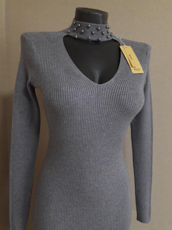 Красива жіночна, сексуальна обтисла модель плаття ідеальної довжини по/за коліно. V-подібний виріз горловини та коміром-стійкою.Плаття дуже комфортне та затишне, виповнене зі щільної натуральної тканини в рубчик, яка добре тягнеться (ефект гумки) на потрібні параметри та гарно сідає на фігурі повністю в обтягнення.Ефектна декор-прикраса з пробивними намистинами на горловині коміра.