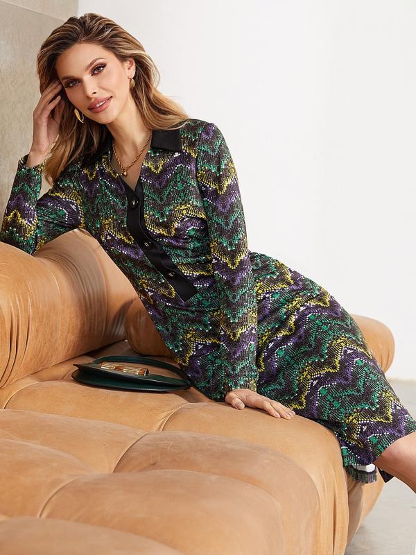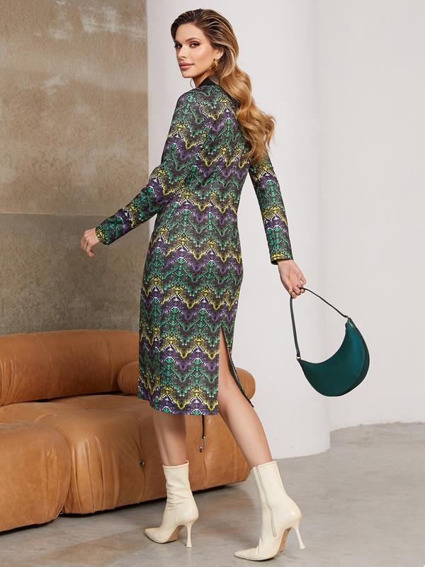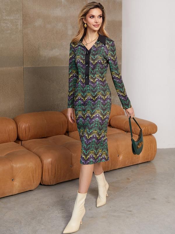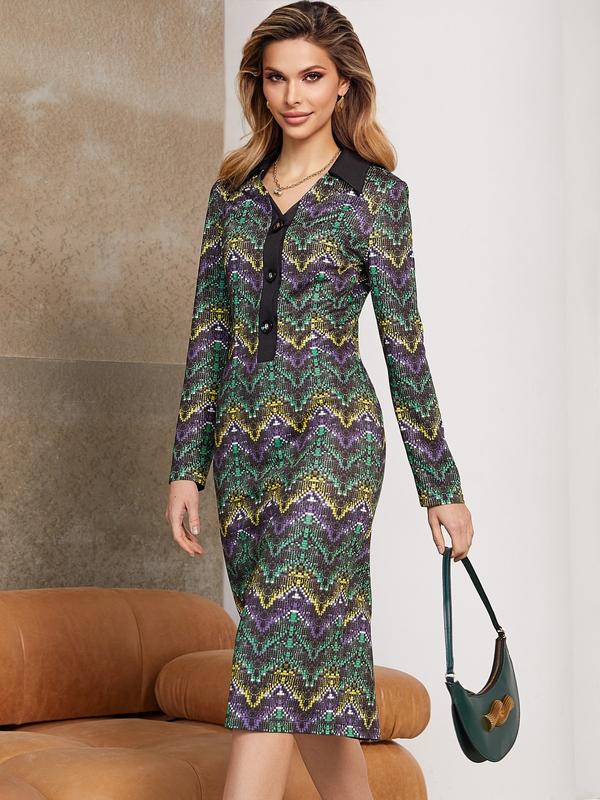 Приталена сукня з трикотажу з принтом та відкладним коміром. Застібається на гудзики за планкою. Позаду розріз.