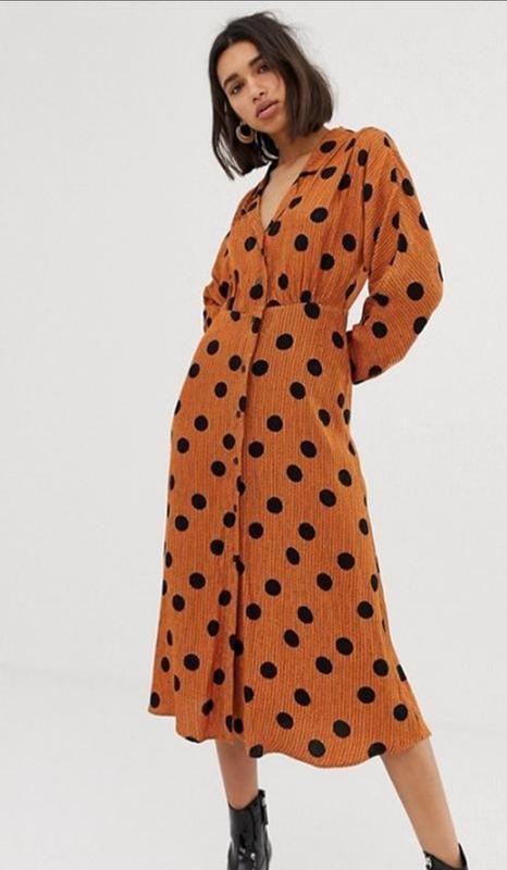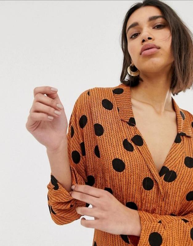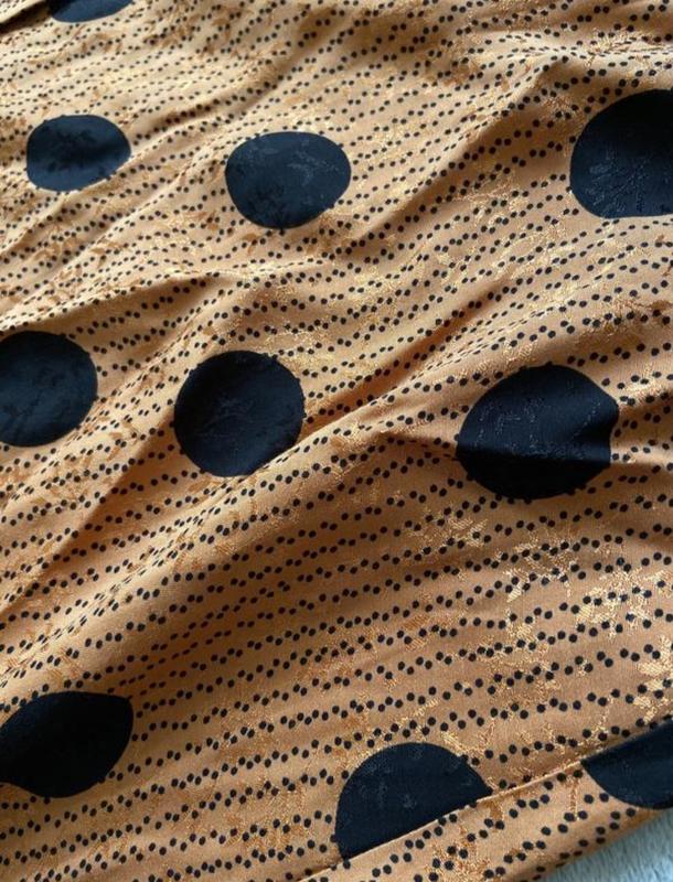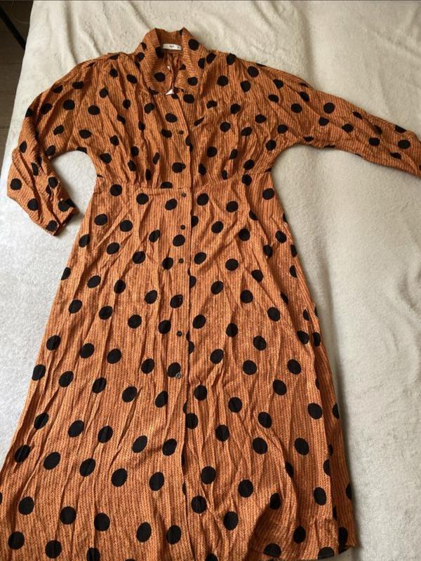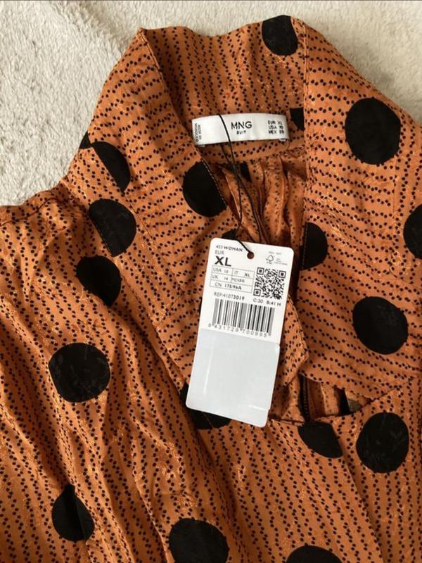 Нове плаття-сорочка манго розмір вказаний ХЛ, буде також і на Л як оверсайз, тканина тонка приємна майже не мнеться, у складі є полірована нитка, яка в тон основної тканини, завдяки цьому плаття гарно переливається, принт горошок, шалено стильне, дивіться заміри: