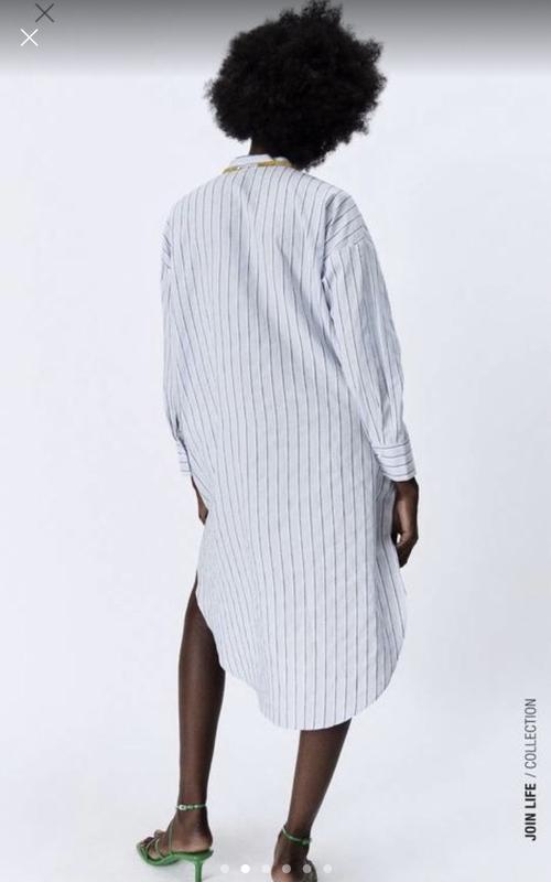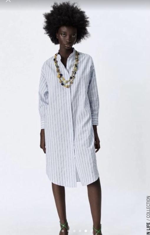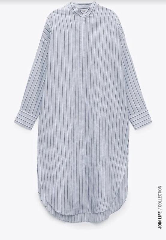 Платье-рубашка нежно-голубого цвета в полоску, длина миди, оверсайз рукав спущенный.