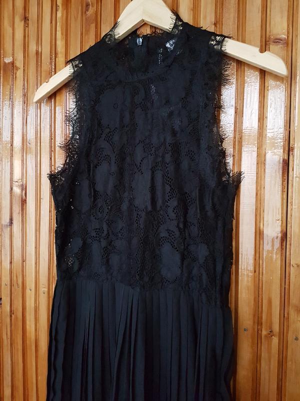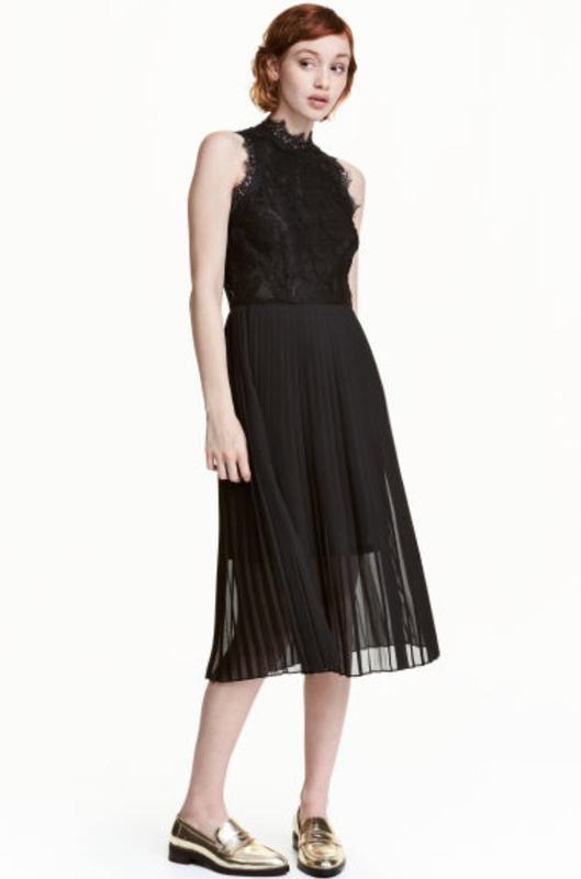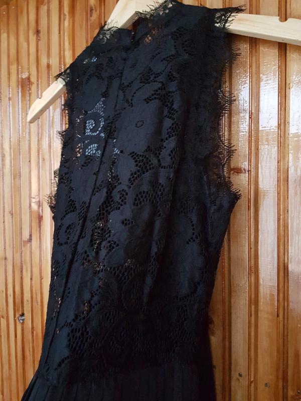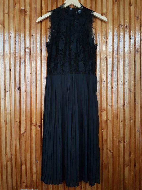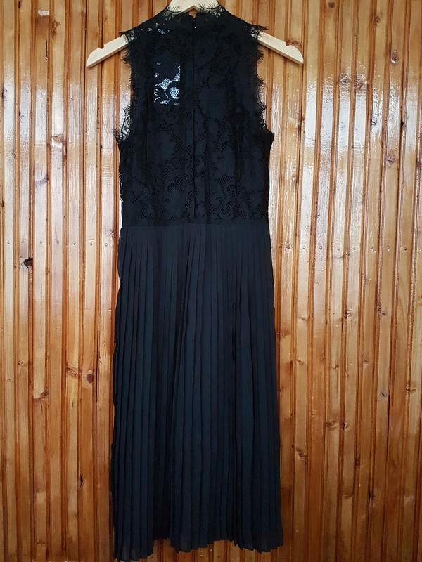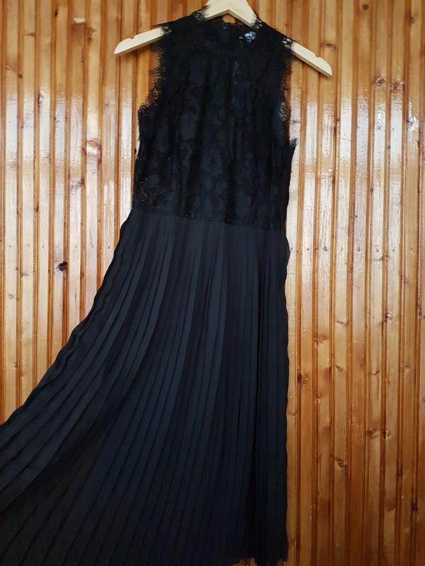 Дуже красиве і ніжне вечірнє, випускне плаття міді H&M без рукавів з мережива і з плісованою спідницею. Розмір в наявності 44. Потайна блискавка ззаду. На підкладці, під мереживом підкладка з тоненької сітки.