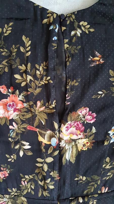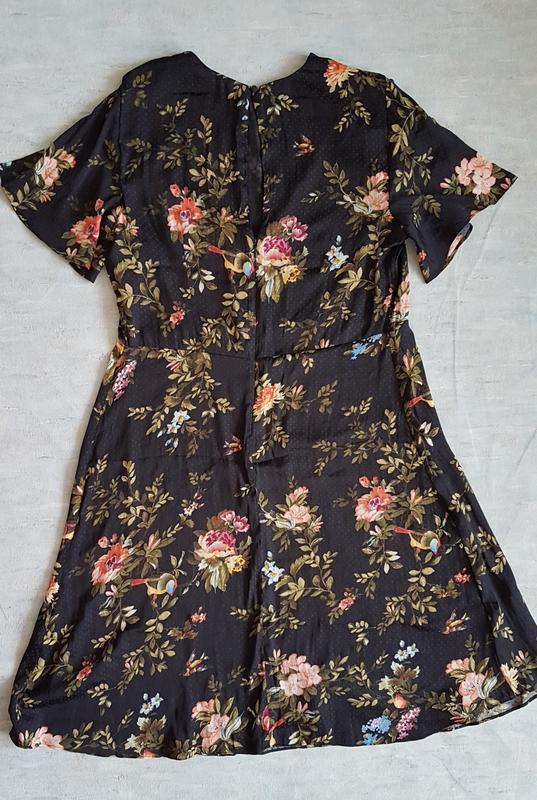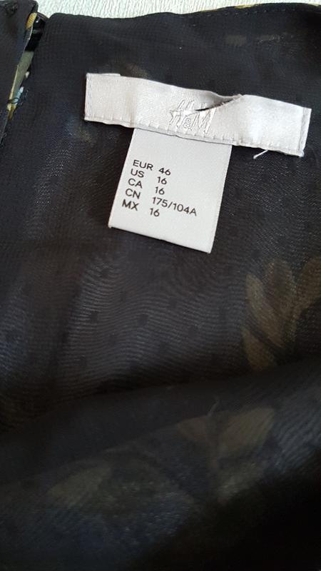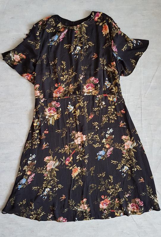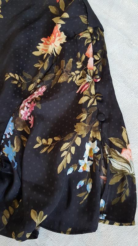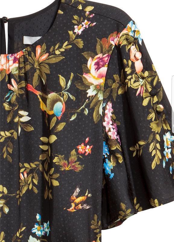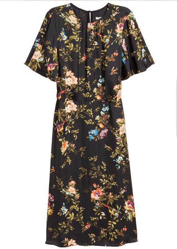 Гарне плаття міді H&M в квітковий принт. Розмір на бірці 46. Короткі рукави з розрізами, декоровані гудзиками. На спинці застібається на блискавку і гудзика, є невеликий розріз. Плаття на підкладці. Нове, без паперової бірки.