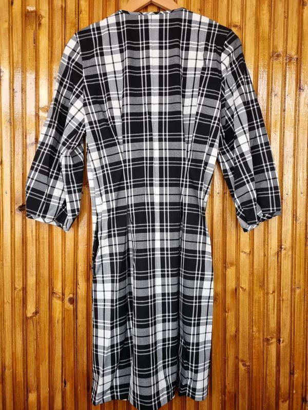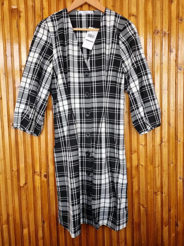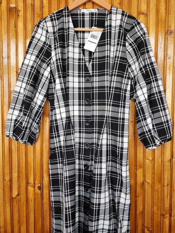 Міді плаття сорочка Mango в клітинку. В наявності розміри M і L. Спереду застібається на гудзики. В талії призібрано. По боках кишені.