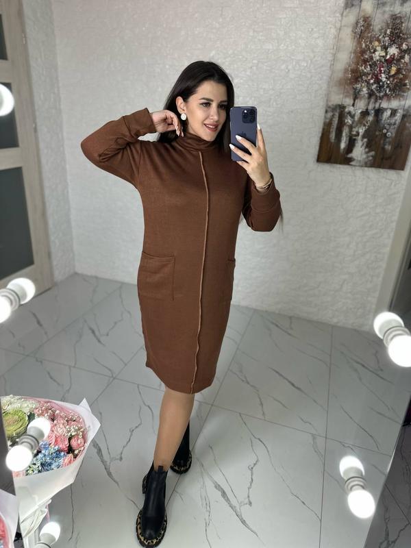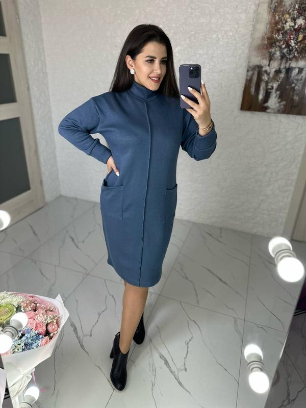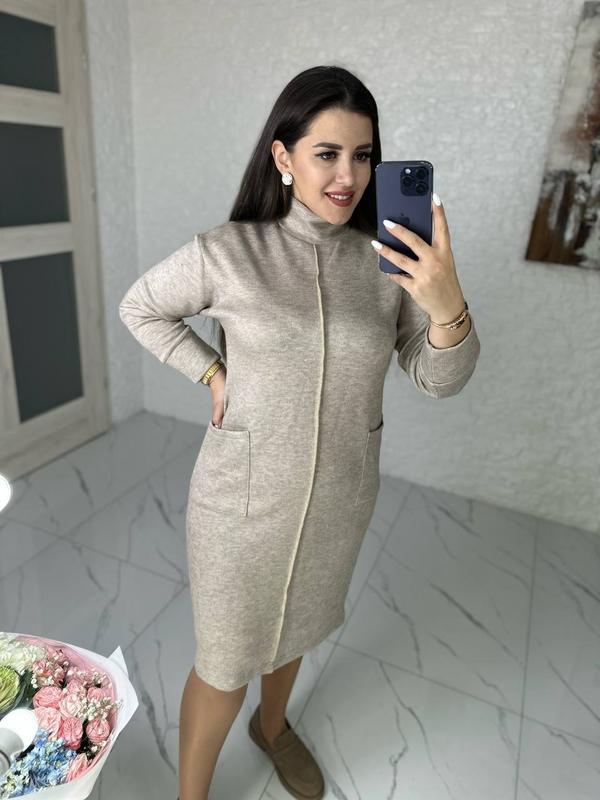 Плаття нижче колін , довгий , приспущений рукав на широкому манжеті , горловина стійка , з боків дві кишені , по центру плаття шов.