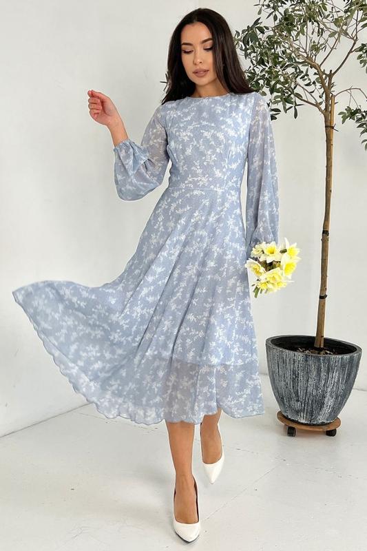 13846_серый Сіра класична сукня із квіткового шифону з нижньою текстильною підкладкою. Модель приталеного класичного крою із застібкою-гудзиком на горловині та бічною блискавкою. Модель із розкльошеною спідницею міді довжини оснащена довгими рукавами-ліхтариками на резинках.