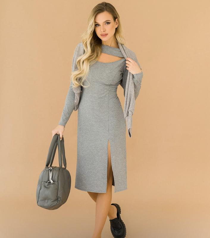 Фактурна сукня виконана із сірого трикотажного рубчика. Виріб міді довжини з довгими рукавами та прямим кроєм. Модель з горловиним човником та горизонтальним вирізом на грудях декорована розрізом.