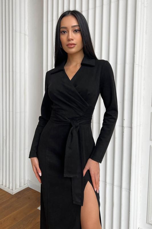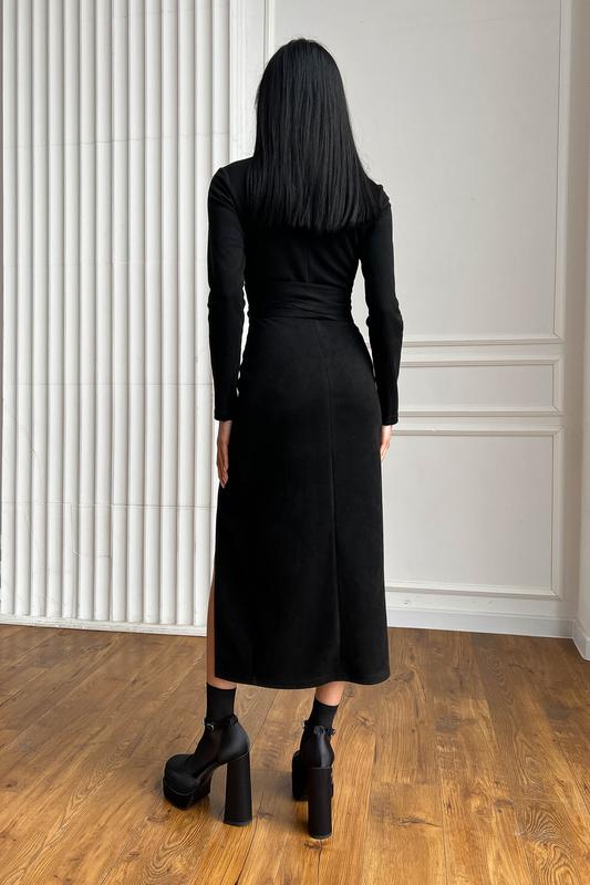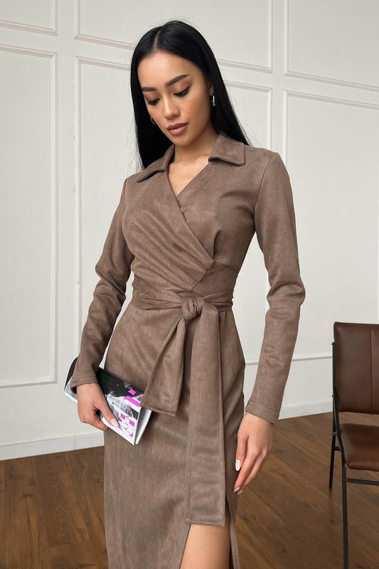 Стильна сукня міді виконана з м'якого матеріалу еко-замші. Модель стилізована складами на талії, що допомагають зробити додатковий акцент на жіночних вигинах фігури. Ліф на запАх, пояс вшитий. Рукав довгий, по нозі високий розріз, по спинці передбачена блискавка для вашого комфорту.
