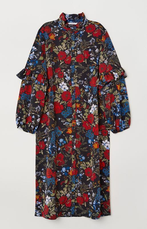 Гарне плаття міді H&M в квіти, з воланами. Розміри в наявності 36, 40. Спереду повністю застібається на гудзики. На рукавах і горловині оборки. Рукава знизу на гумці. Крій вільний, трапецією. Трохи більшомірять. 36: ПОГ 52 см, є витачки ПОТ 57 см ПОС 59 см Довжина 115 см Рукав 58,5 см 40: ПОГ 55 см, є витачки ПОТ 60 см ПОС 62 см Ширина в плечах 42 см Довжина 115 см Склад: 100% поліестер. Нові, без паперових етикеток.