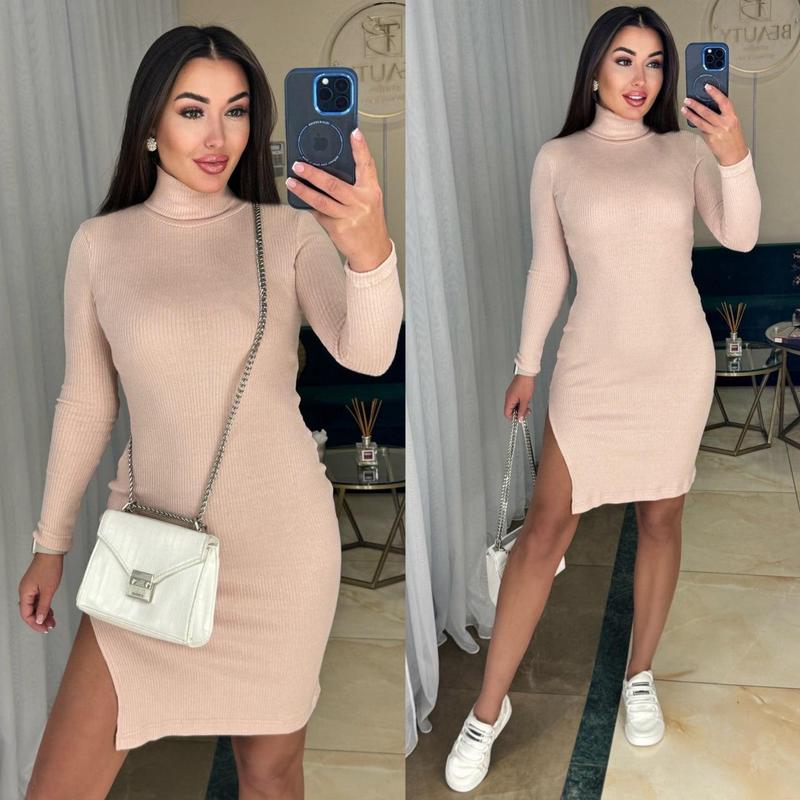 Ангорова жіноча бежева сукня з вирізом в рубчик
