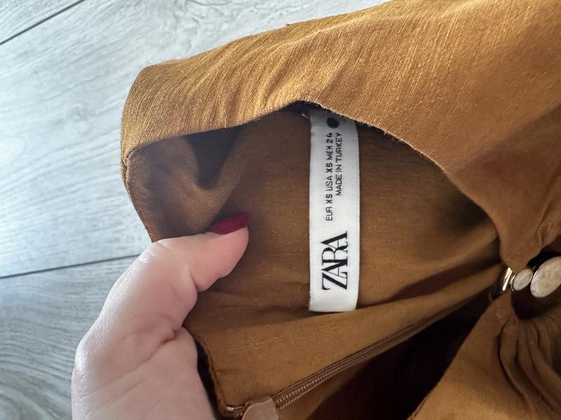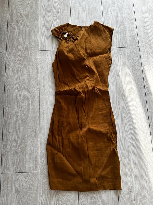 Оранжевое льняное платье сарафан на тонких бретелях миди zara
