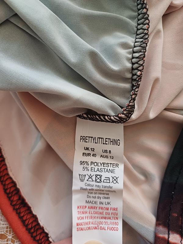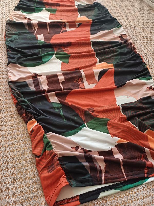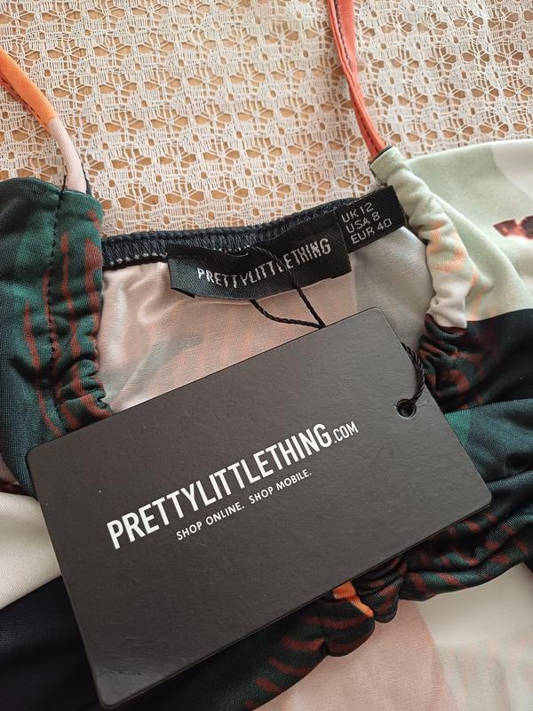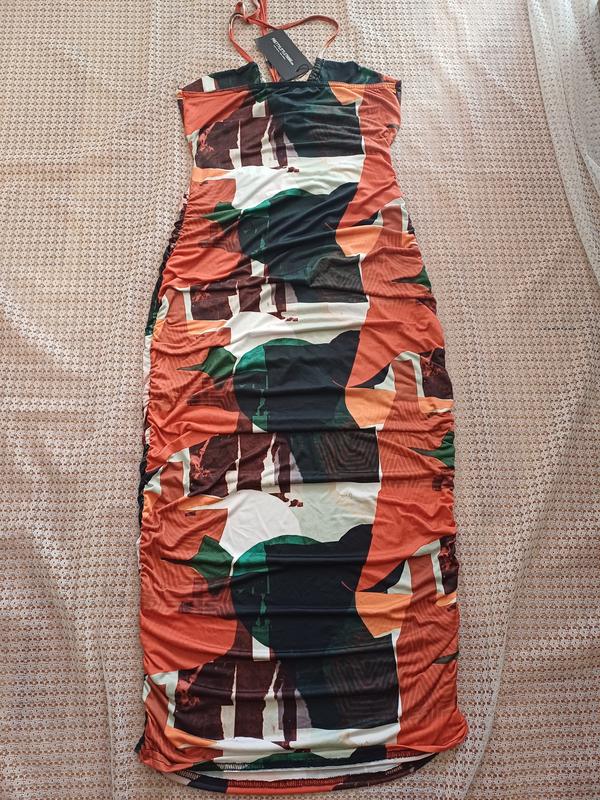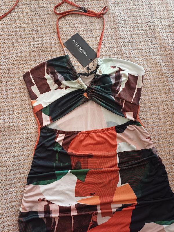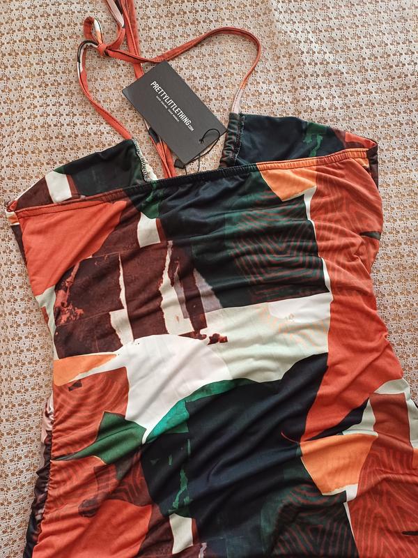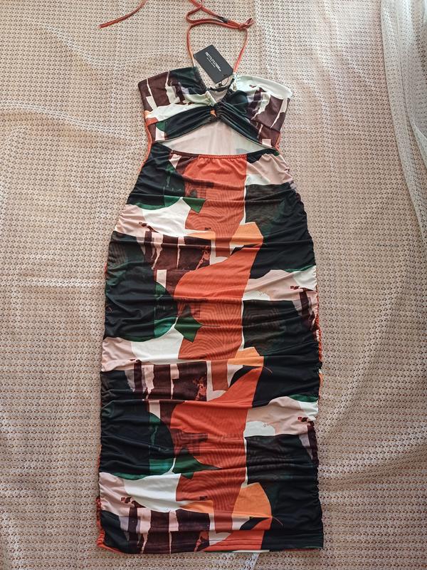 Ефектна міді сукня зі сборочками і вирізом в абстрактний принт PrettyLittleThing