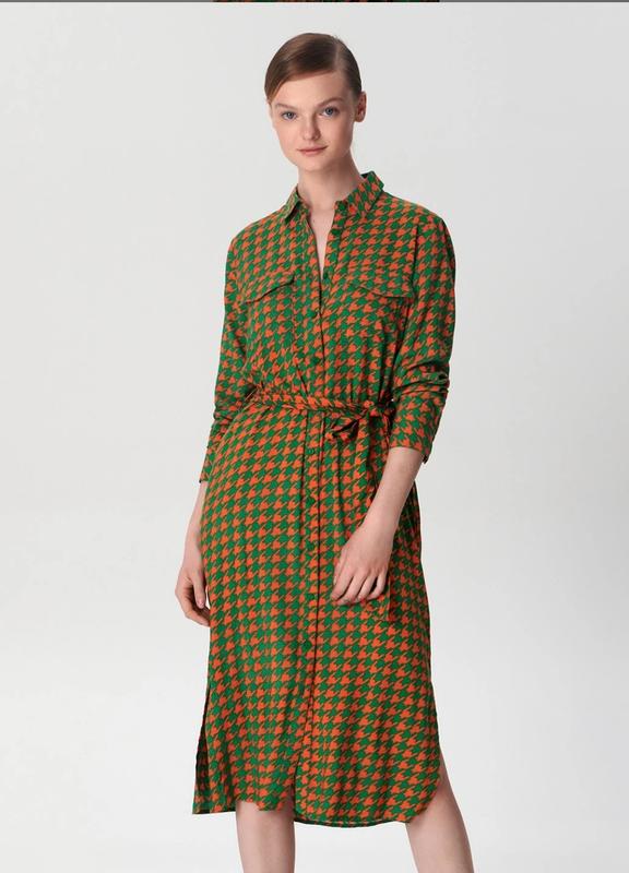 Стильна жіноча сукня Sinsay Розмір на боці M (по факту M-L) Заміри: Обхват грудей 92-95 см Обхват талії 72-75 Обхват стегон 98-104 см Ідеально виглядатиме при рості 172 і більше. При нижчому рості буде трохи довшою ніж на моделі. Колір: оранжевий і зелений Застібається на гудзики З поясом Матеріал 100% віскоза Країна бренду Польща Країна виробник М'янма Сукня нова