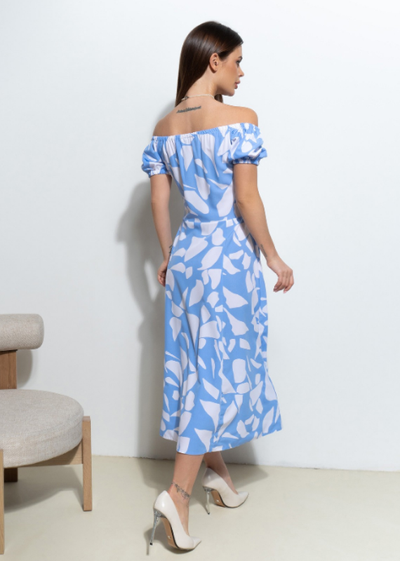 Блакитне ретроплаття із софту з приспущеними плечима на гумці. Сукня міді довжини з розкльошеним низом, декорованим бічним розрізом. Модель із короткими рукавами-ліхтариками на гумках та приталеним кроєм.