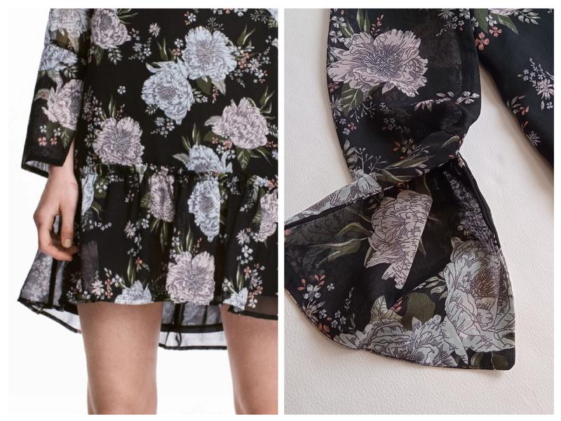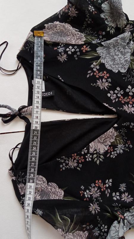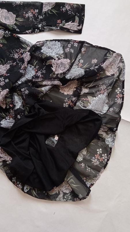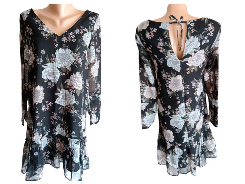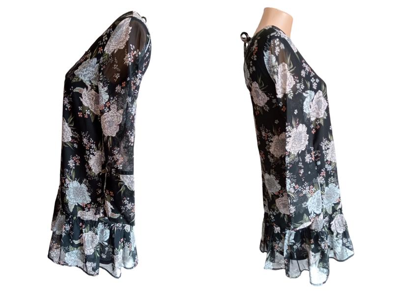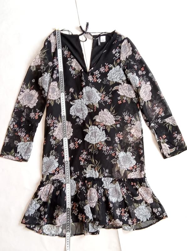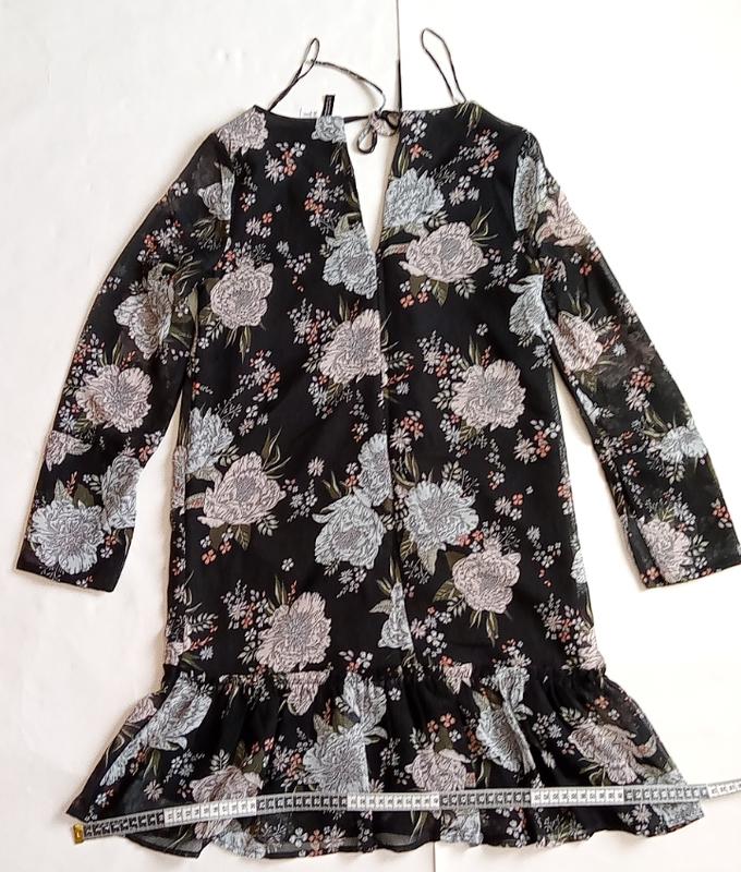 Супергарне потримоване чорне прозоре плаття прямого крою з квітковим принтом і рукавами 3/4 від H&M, з оборками по краях. На підкладці. Зав'язки ззаду на шиї. Не розтягується, тому перевірте розміри. Жодних плям, дірок і задирок. Будь ласка, задавайте всі питання перед купівлею.