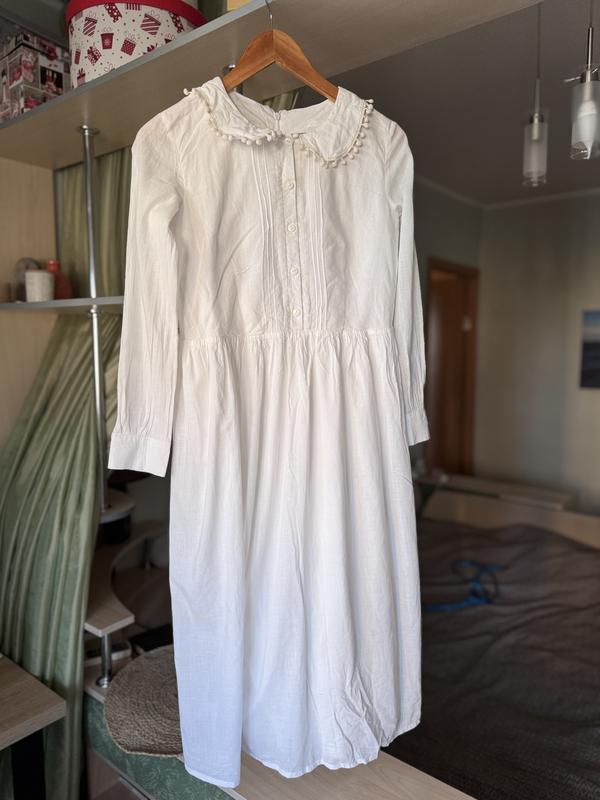 Сукня українського бренду ANNA YAKOVENKO. Стан відмінний. Бавовна 100%. Довгий рукав, але вона тоненька та приємна до тіла, тому навіть в спеку в ній дуже добре. Цікавий вінтажний комірець з китицями. Колір ніжно-ніжно молочний. Позаду застібка на змійку. Є спідня юбка (підклад). Загальна довжина 109см.