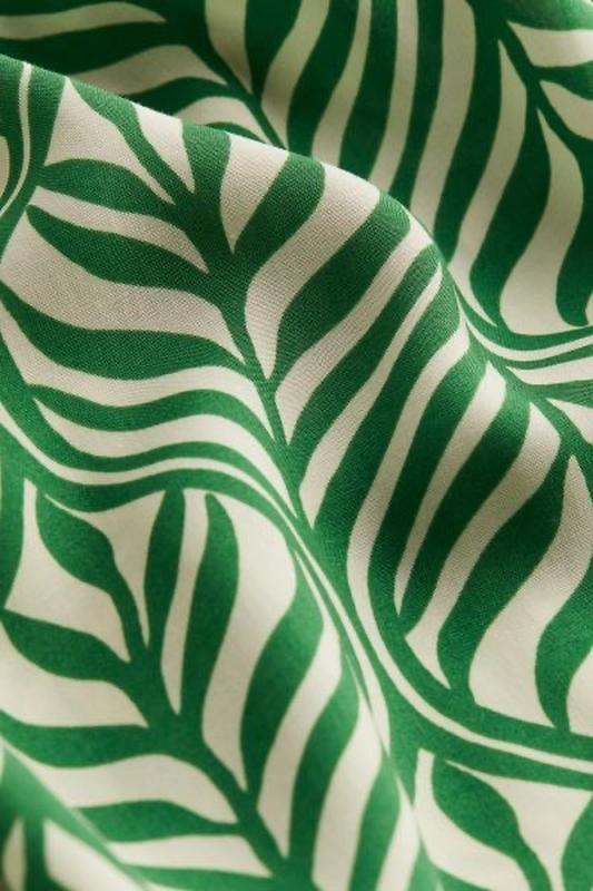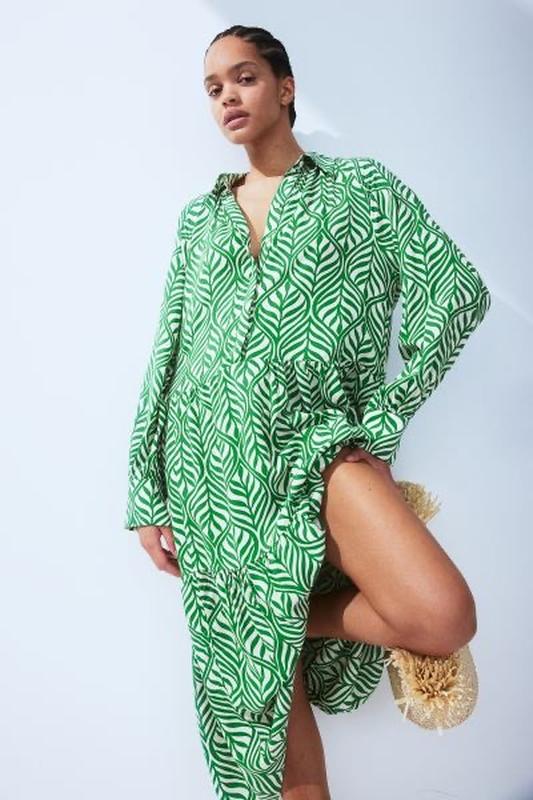 Сукня з віскозної тканини з коміром. Криті кнопки зверху. Довгі регланові рукави з застібкою-манжетою, злегка розширений низ з гофрованими вирізами.