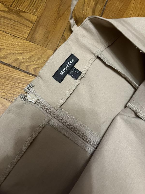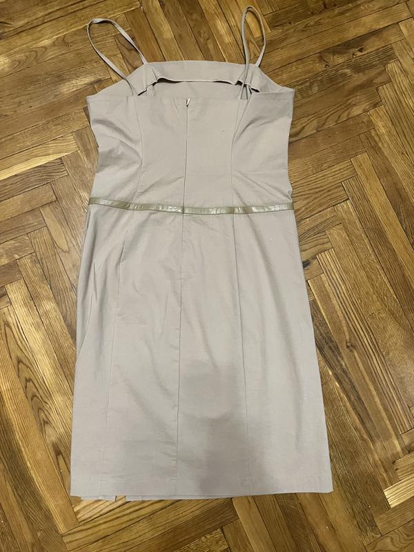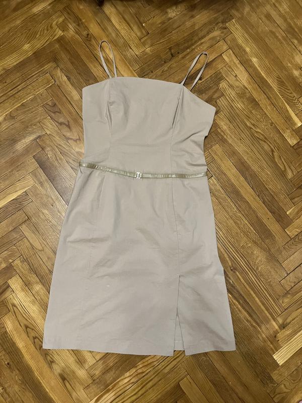 Гарна, дуже стильна сукня-сарафан бежевого кольору, ідеальна на весну та літо 🥰 довжина міді (до коліна). Склад 66% бавовна, 28% поліамід, 6% еластан. Добре тягнеться і тримає форму. Є невеликий розріз на лівій нозі. На талії має тоненький пояс. !! Є маленький дефект !! Видно на фото 5, маленька біла крапочка. У житті майже непомітно. Застібається на молнію до талії.