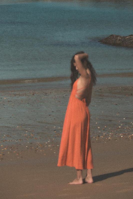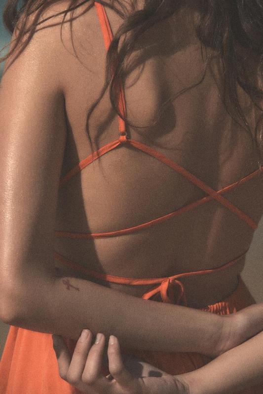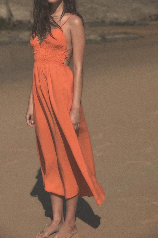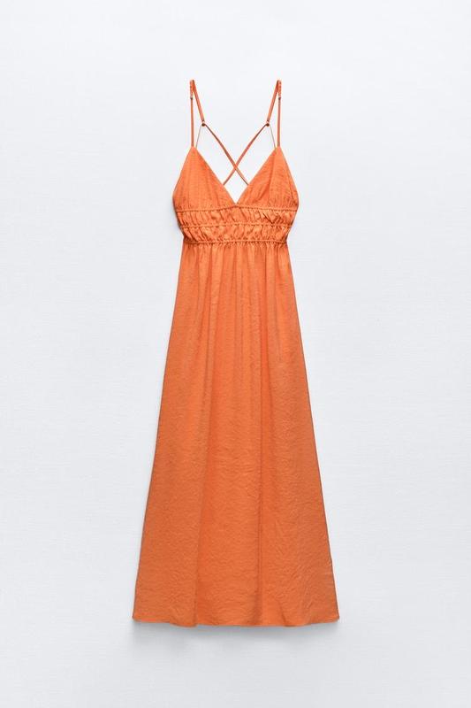 Струмуюча сукня середньої довжини з V-подібним вирізом і тонкими регульованими бретелями, що перехрещуються та зав’язуються ззаду.Помаранчевий | 3092/796