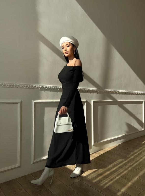 Чорна сукня-міді виконана з трикотажного матеріалу, який чудово сідає по фігурі.