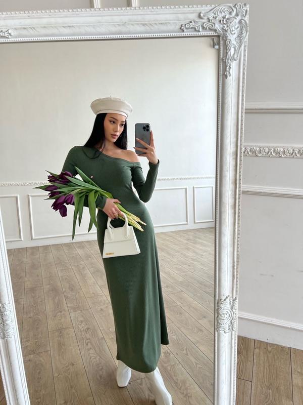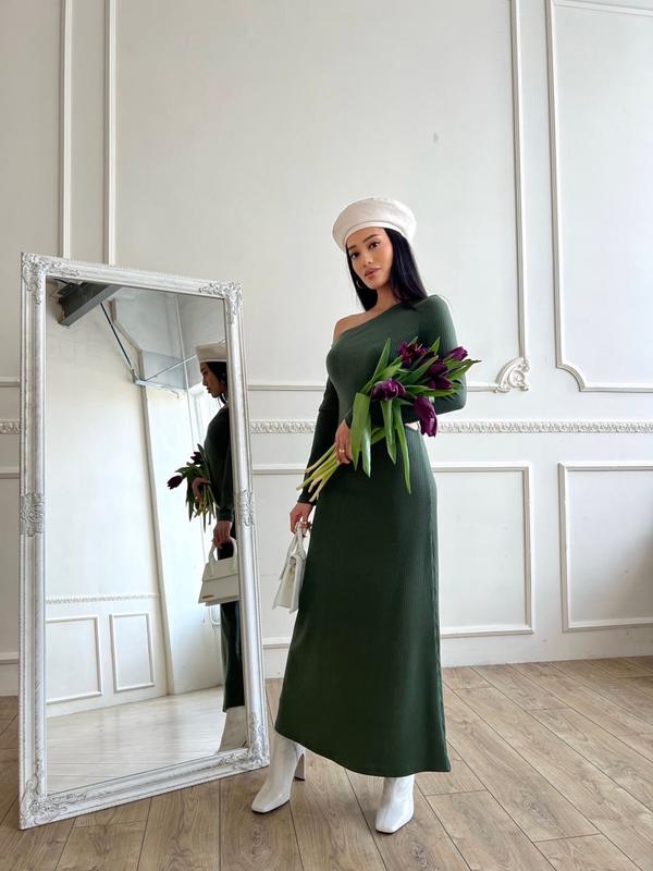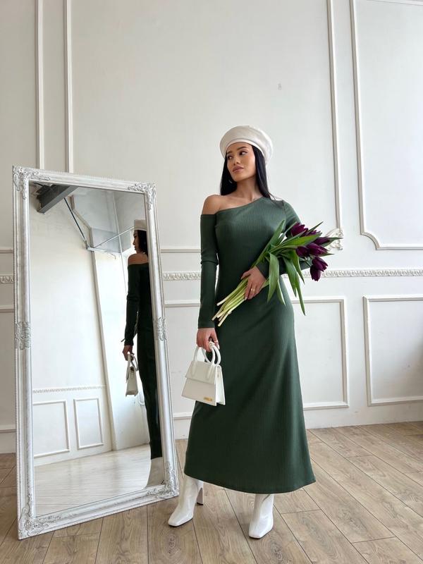 Модель стилізована асиметричним вирізом з боку. Сукня представлена з відкритим плечем, що додає образу жіночності та вишуканості.