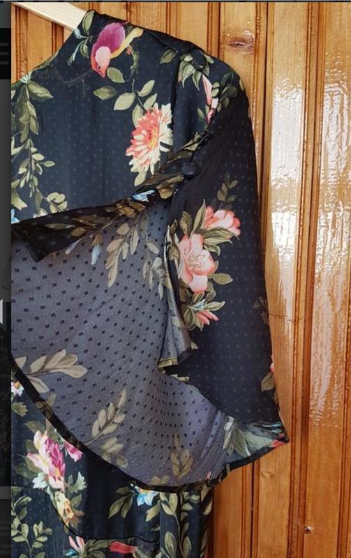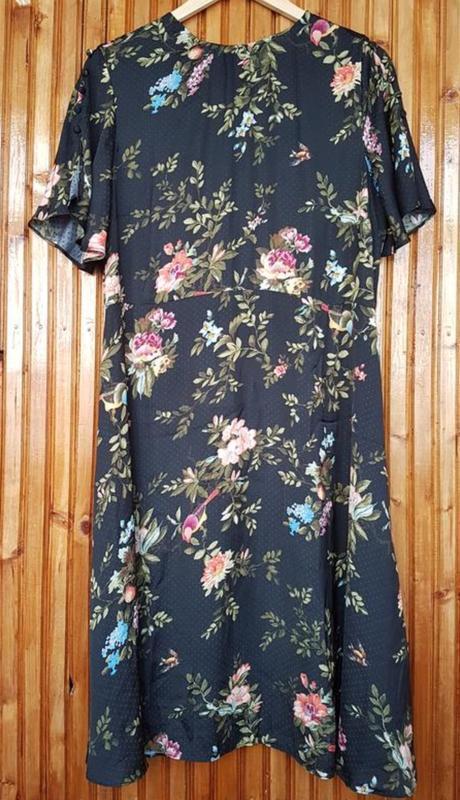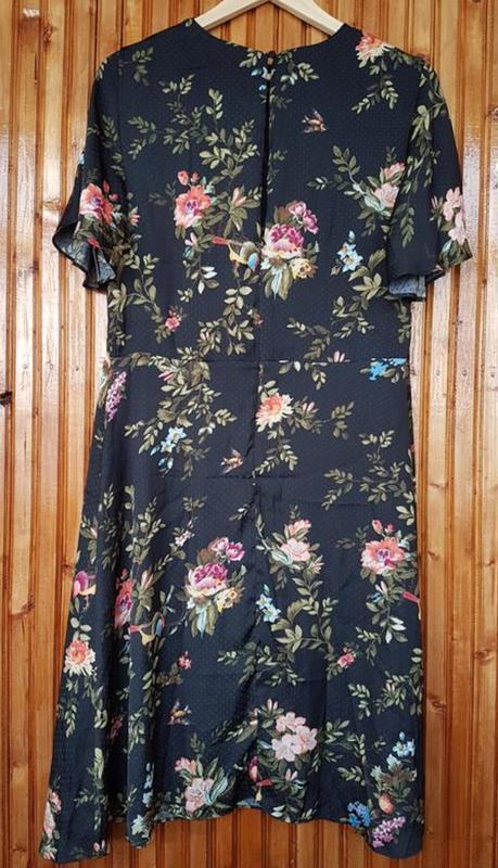 Гарне плаття міді H&M у квітковий принт. Розмір по бірці 46. Трохи маломірить. Короткі рукави з розрізами, декоровані ґудзиками, обтягнутими тканиною. Відрізна лінія талії. На спинці застібається на блискавку та ґудзик, є розріз. Плаття на підкладці. Нове, без паперової бірки.