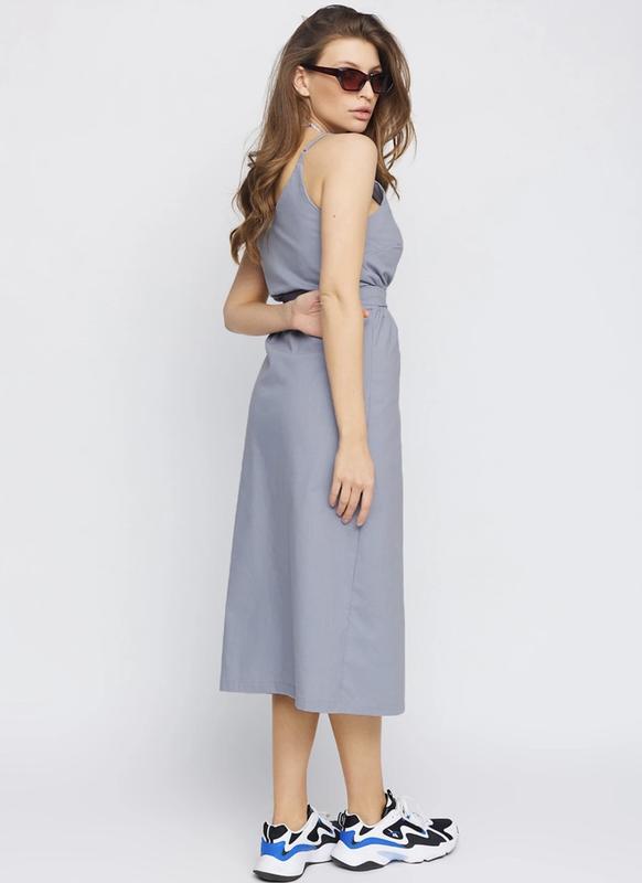 Літня сукня на запах з щільного льону; довжина міді, глибоке декольте, тонкі бретелі з регулятором та вшитий пояс. Склад 80% льон, 20% поліестер.