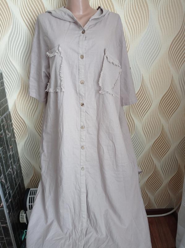 Стильна, легка сукня з капюшоном,по боках є розрізи! Тканина льон! Пог-70 поб-79 довжина -124 рукав підстібається на гудзик! Виробництво Італія! Якість бомбезна! Оплата на карту!