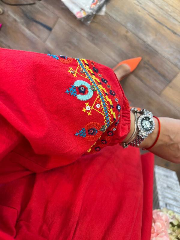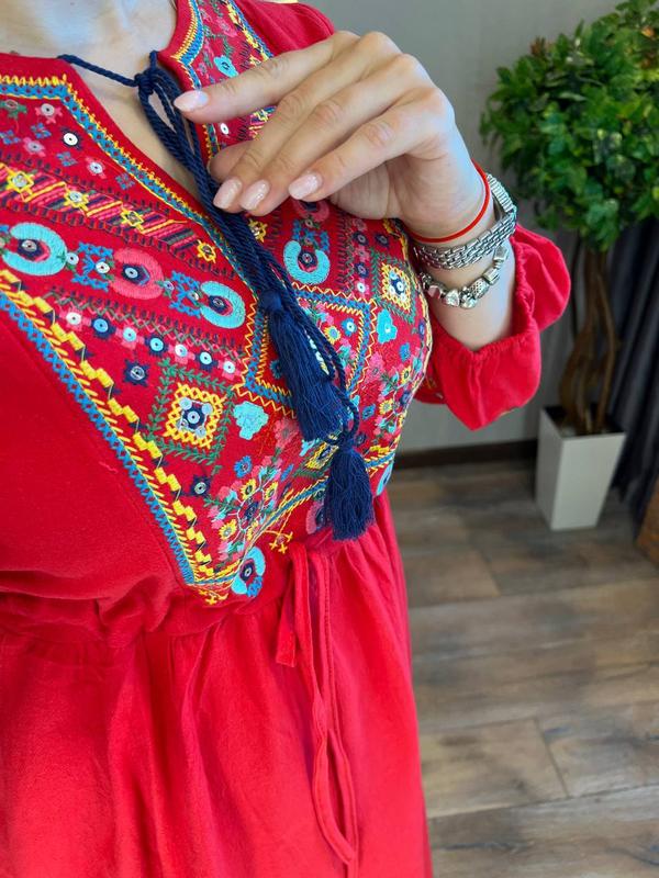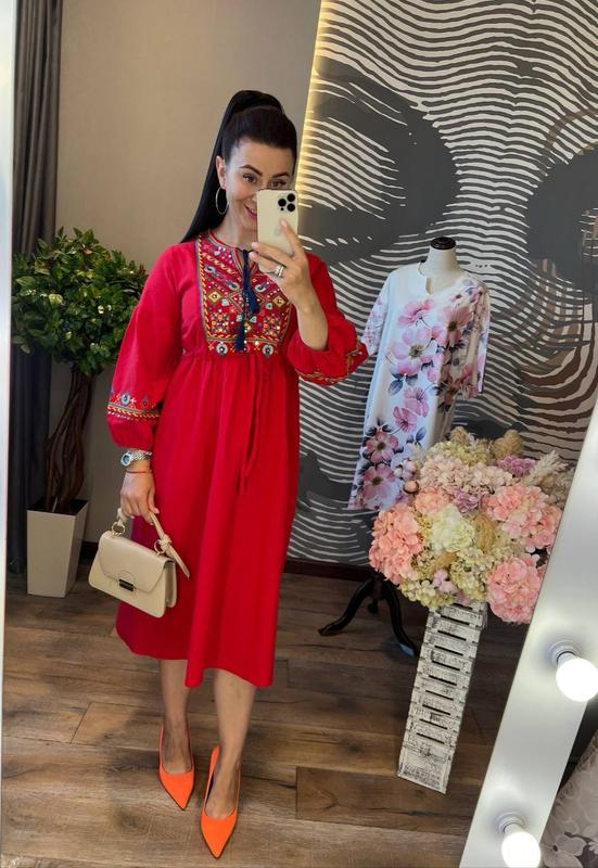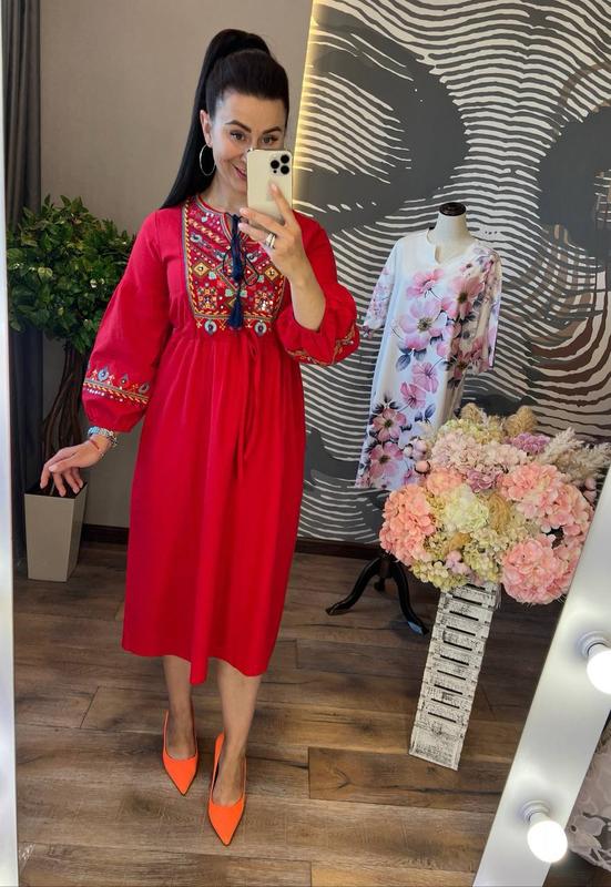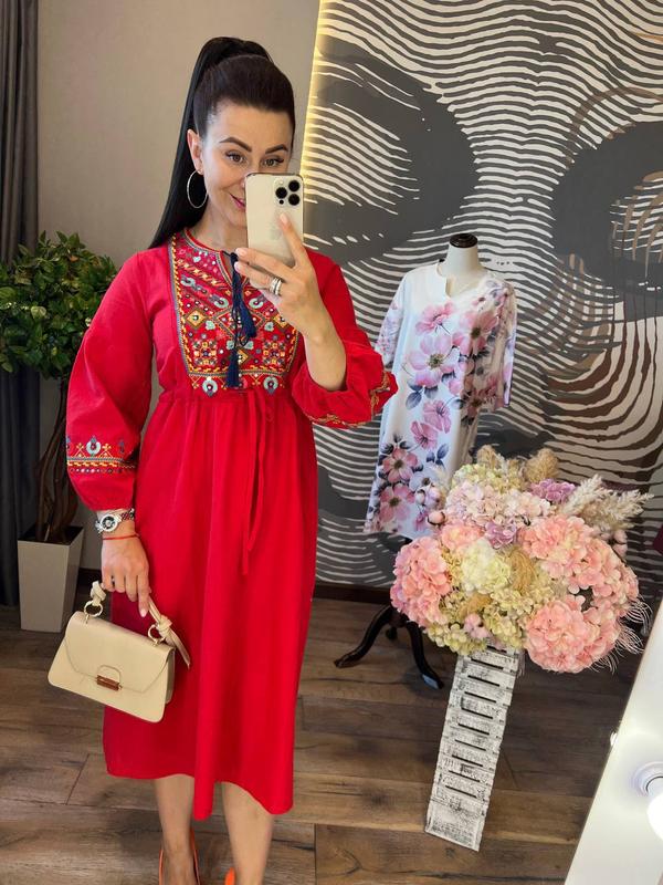 Жіноча літня лляна сукня вишиванка міді з вишивкою і довгими рукавами червона льняне вишите плаття з льону льон