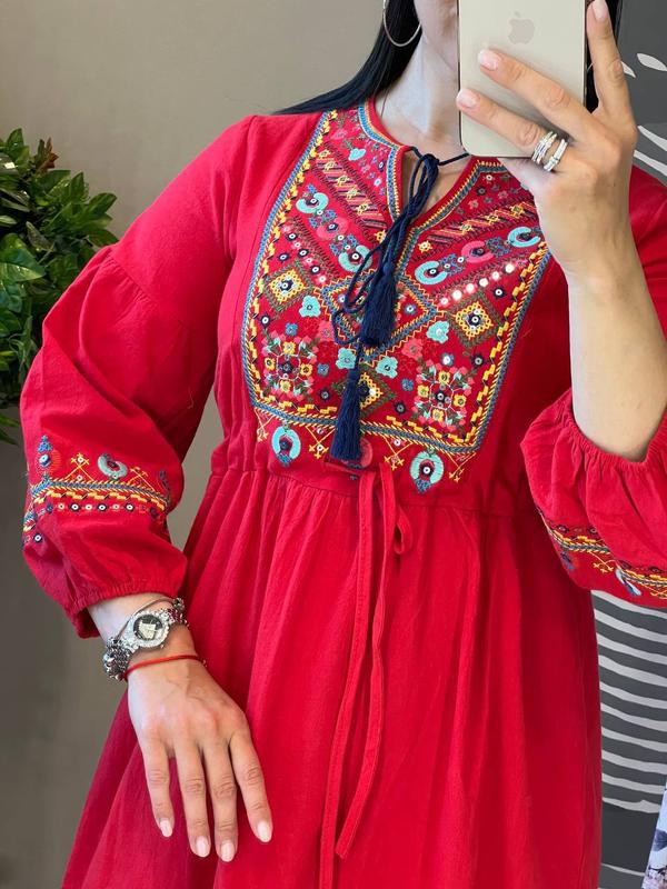 Неймовірно красива й універсальна сукня прямого силуету з елегантним розрізом на грудях, пишними рукавами на гумці внизу, зручним вшитим поясом, що чудово підкреслює красу вашої фігури. З приголомшливо гарною вишивкою на грудях, сукня виготовлена зі штучного льону високої якості.