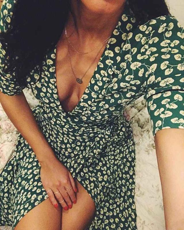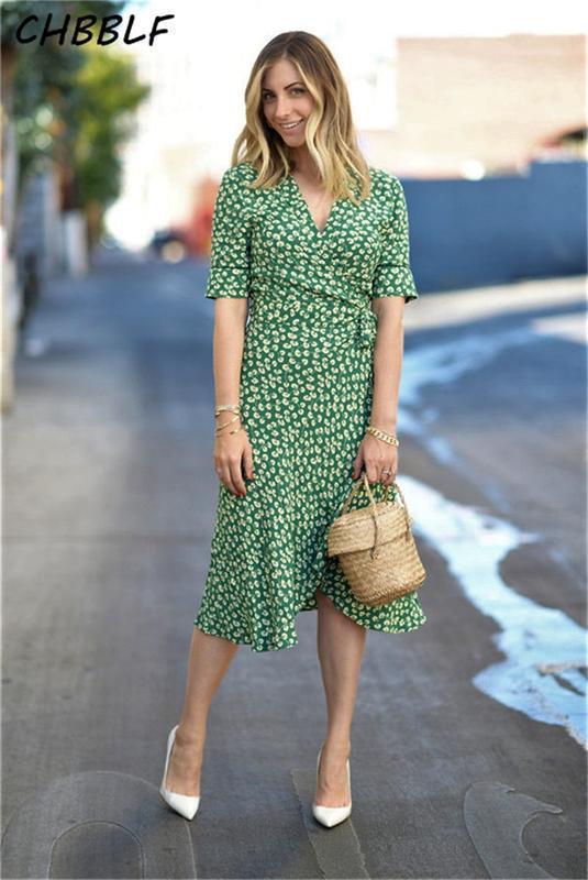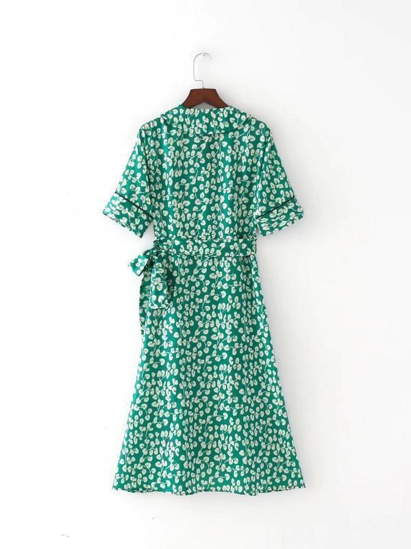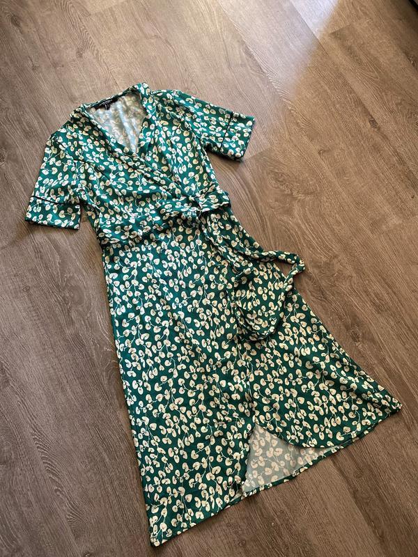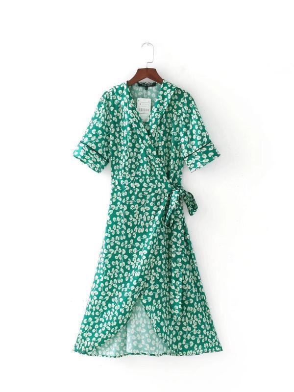 Асиметричне зелене плаття халат міді з принтом на запах .