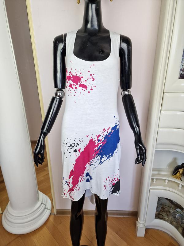 Продам стильне пляжне плаття з віскози. Плаття виготовлене з легкого та дихаючого матеріалу, що ідеально підходить для спекотних літніх днів. Приємний білий колір плаття прикрашений яскравими абстрактними малюнками в рожевих, синіх і чорних тонах, що додають виробу оригінальності та виразності. Відкрита спина та зав'язки на шиї надають платтю елегантного та привабливого вигляду, роблячи його ідеальним вибором для пляжу або прогулянок по набережній.