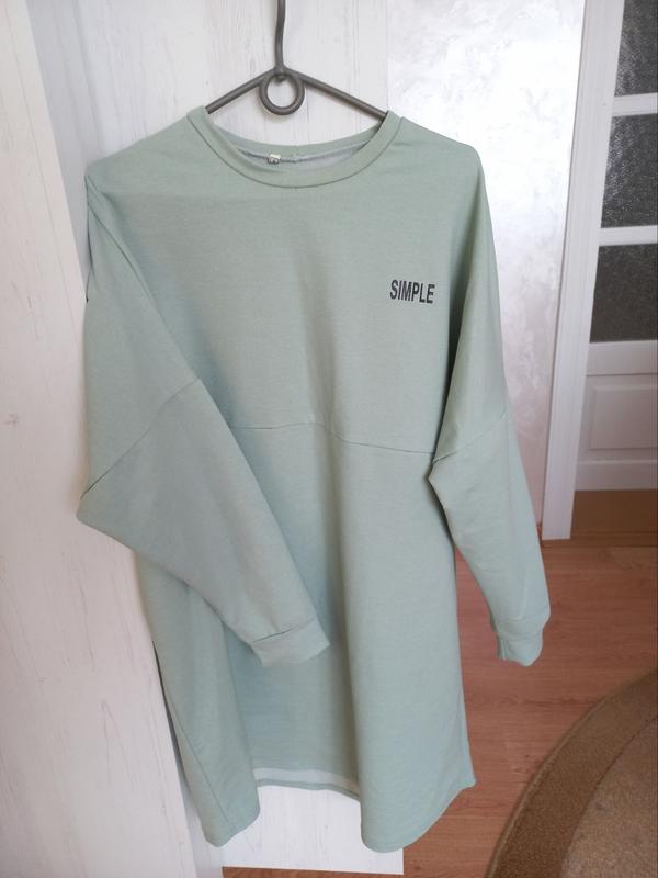 Оверсайс сукня з двонитки,приємного фісташкового кольору фасон рукавів йдуть,як летюча миша,а сама сукня йде ніби донизу трішки звужена. Мені з фігурою груша,не подобалось,бо при хотьбі попу трохи обтягувало. ОГ 69см ОТ 64см ОБ 62см довж.88см розмір приблизно 50-54наш хоча вказано 48 .
