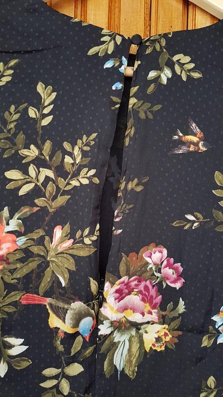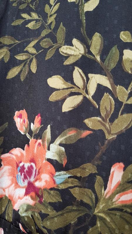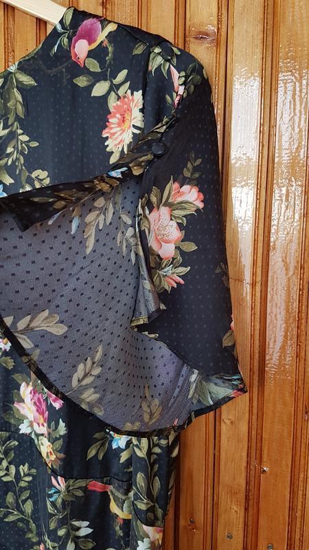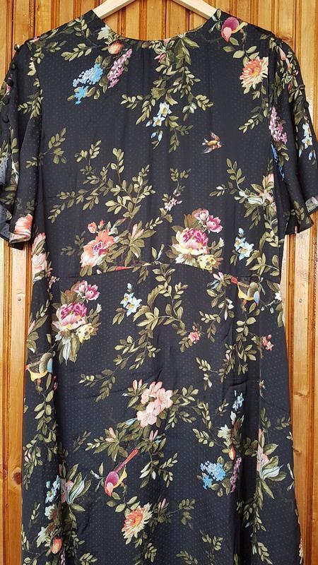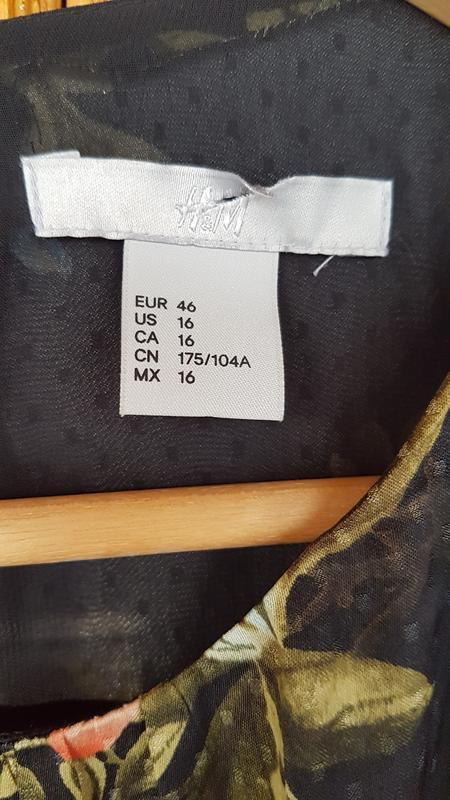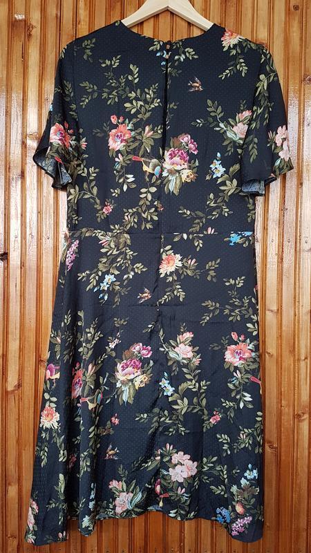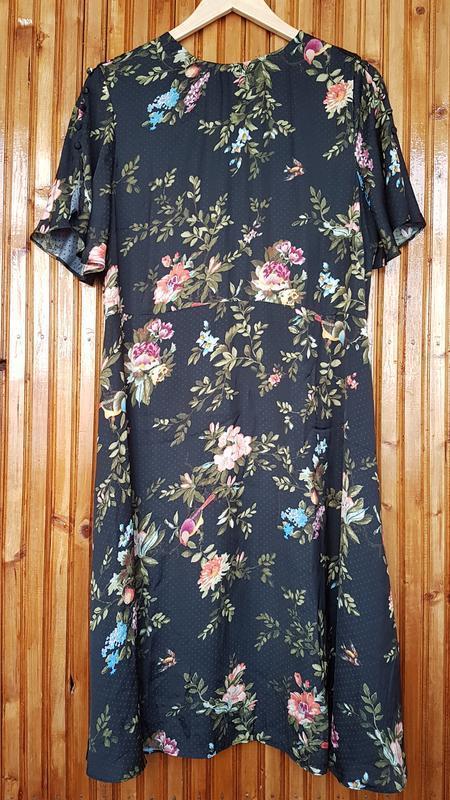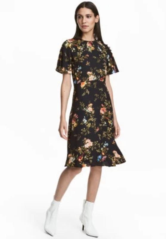 Гарне плаття міді H&M у квітковий принт. Розмір по бірці 46. Трохи маломірить. Короткі рукави з розрізами, декоровані ґудзиками, обтягнутими тканиною. Відрізна лінія талії. На спинці застібається на блискавку та ґудзик, є розріз. Плаття на підкладці. Нове, без паперової бірки.