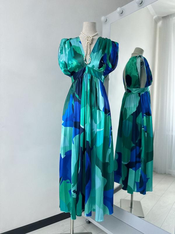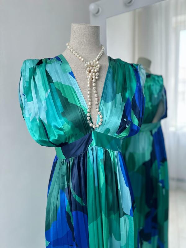 ▪️Шикарна атласна максі з пліссе спідницею🩵Ціна-545 грнРозмір-S-МПог-вільний фасон в грудях, орієнтовно~90 см +-Пот-34 смПоб-вільний Довжина-127 см