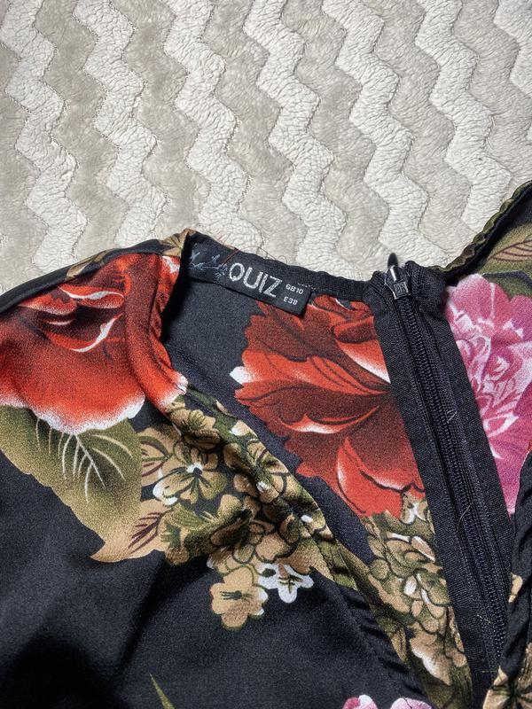 Дуже гарна сукня з квітами, неймовірно жіночна та дуже стильна . На грудях йде на запах , на талії має поясочок можна без , до низу йде модельно розклішона спідниця з розрізом та рюшами по краю . Рукавчики модель- фонарики , придають пишності та обємчику . Легка ніжна тканина .