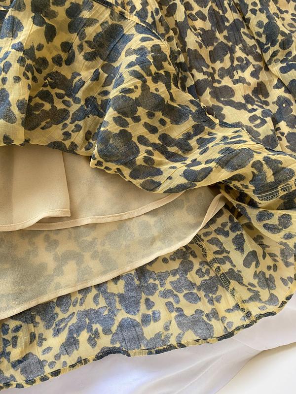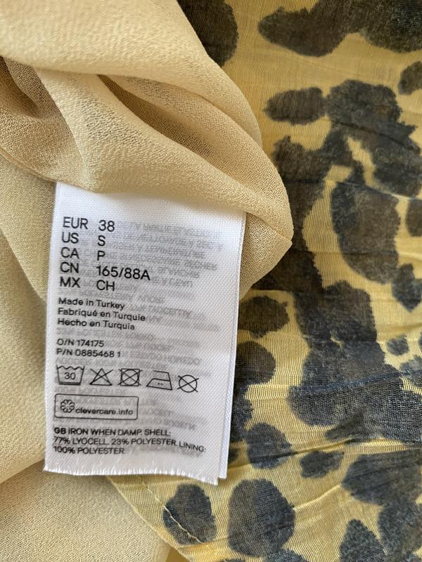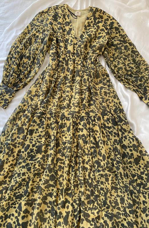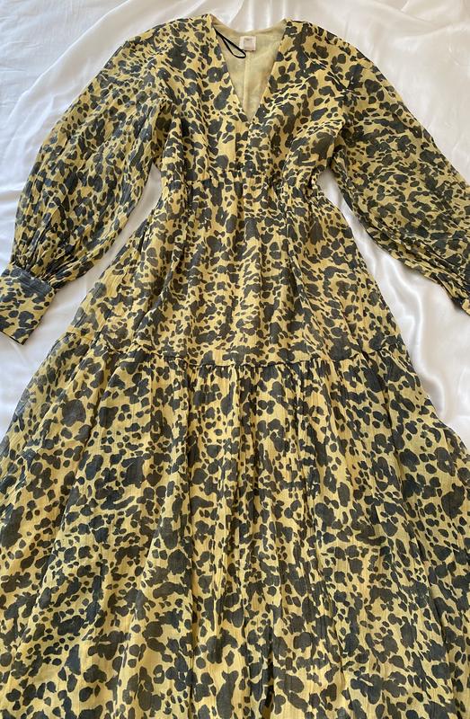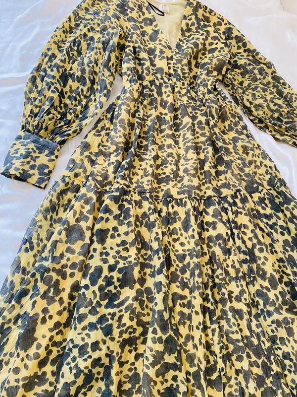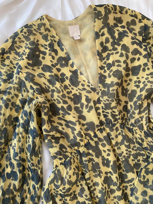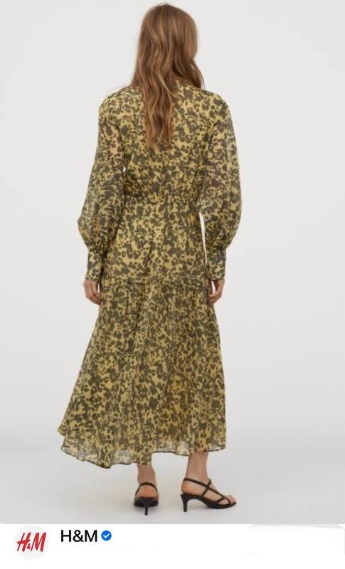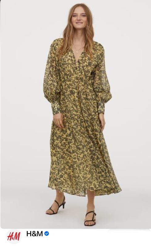 Сукня з V - вирізом, обʼємний рукав на манжеті, в талії є резинка.