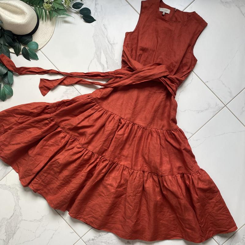 Сукня лляна міді стан ідеальний, колір лососевий, цупка фактура, має вагу, кишені, пояс можна носити наперед чи назад,🔥якість, не тягнеться, спідничка багато тканини, обʼємна р 8 с -довжина 113 -нОг 43 -нОт 35 пояс -нОб вільно 52 ФОТО НА ТІЛІ НЕМАЄ