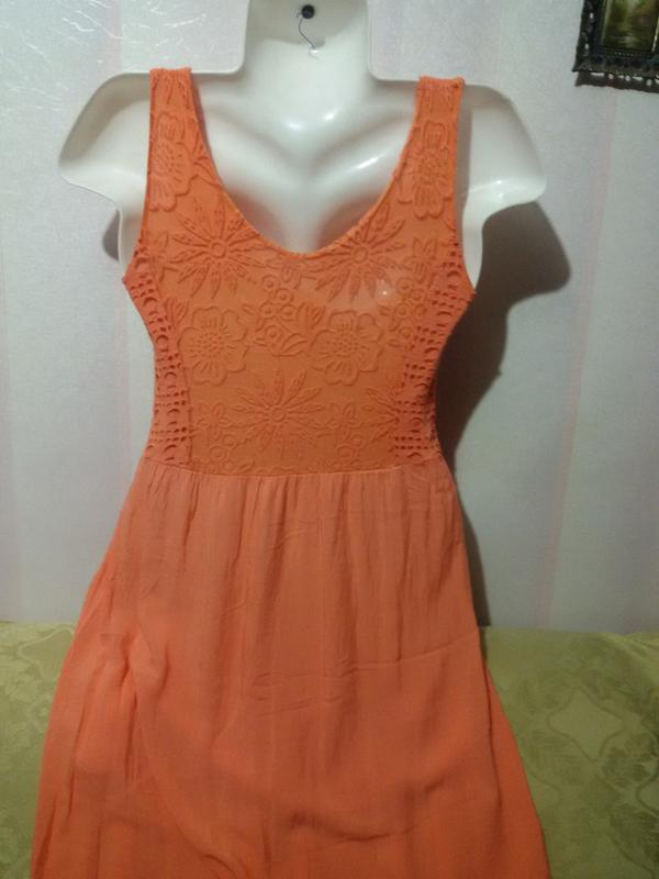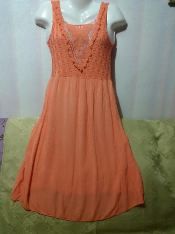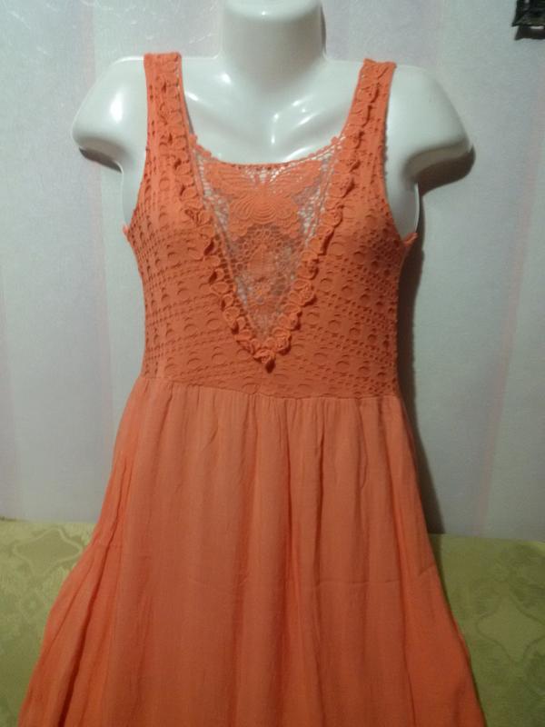 Стан хороший, зауважень немає, тільки прим'ято. Внизу не підшита, просто оверлочено. Спідниця короткий. Тканина тоненька, шовковиста. Колір яскравий, морквяний, насыщенее, ніж на фото. Верхній ліф в дірочках, трикотажне полотно. Мереживо котоновое. Дуже красиво виглядає. Тільки відпрасувати. Розмір не вказаний. Заміри : Довжина 109 см ПОГ 41-48 см ПОТ 41-45 см ПОБІДИ 58 см + Висота пройми рукава 20,5 см