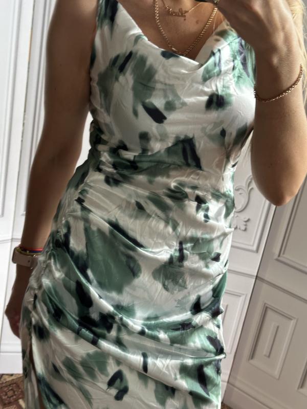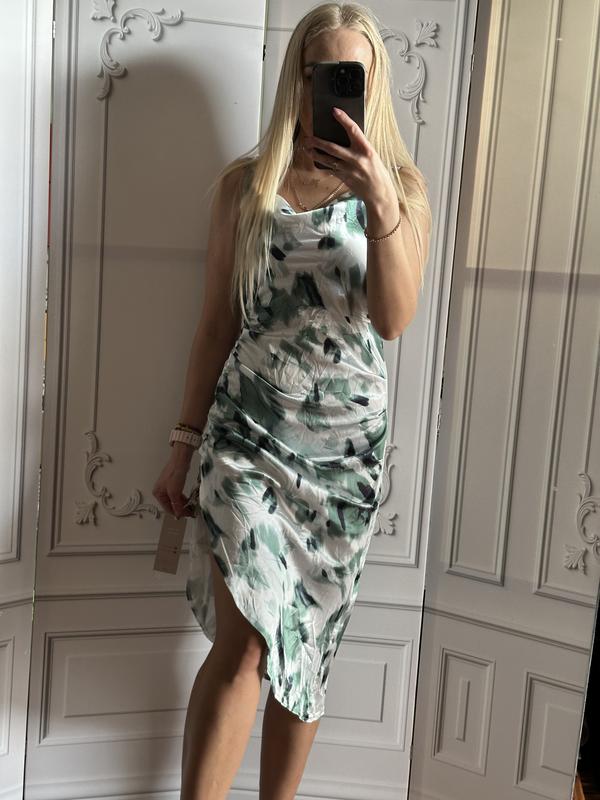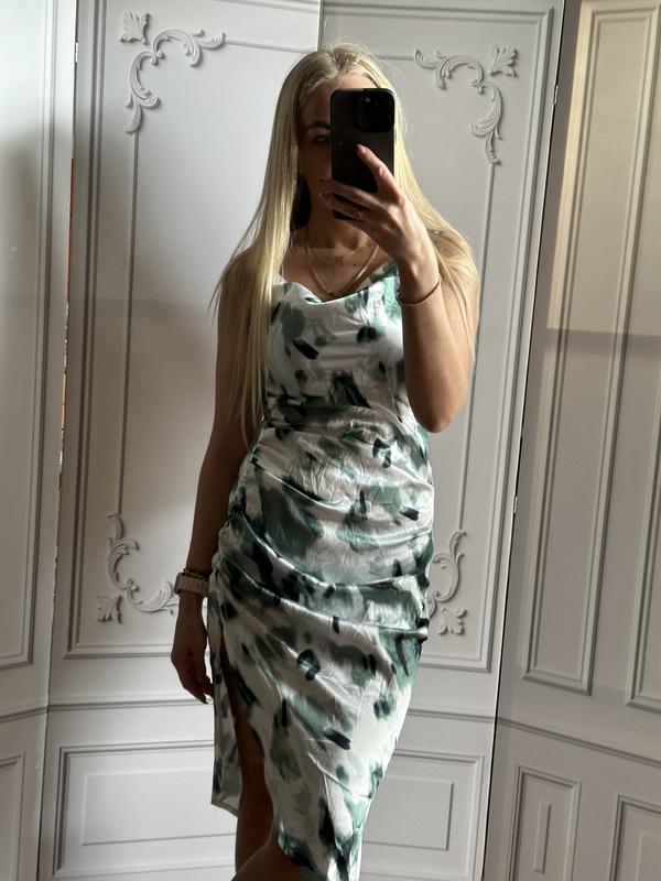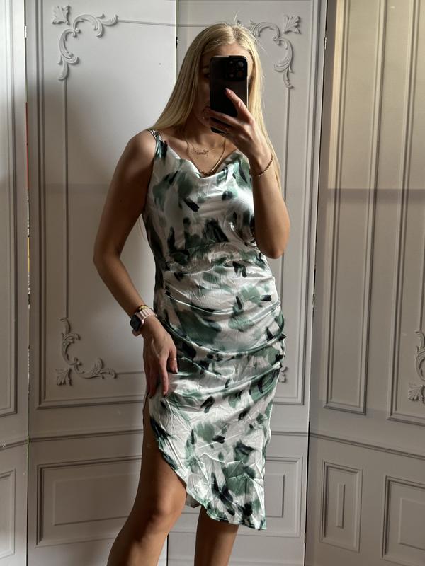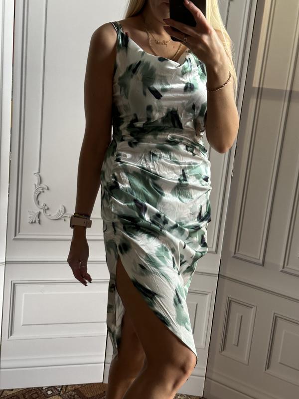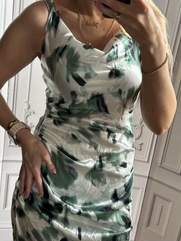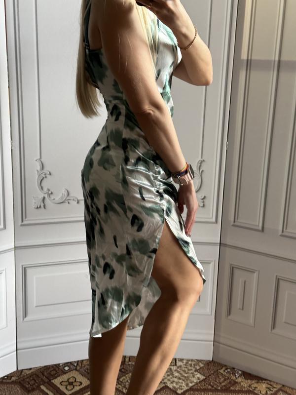 Довжина братели регулюється довжина сукні з 1 сторони іншої сторони 74 ширина в грудях спокійному стані від пройми до пройми рук 46 сантиметрів ширина в районі талії в спокійному стані 36 ширина в бедра спокійному стані 47 сантиметрів має з лівої сторони дуже гарний розріз сукня має асиметричну довжину розмір по бірці вказано М